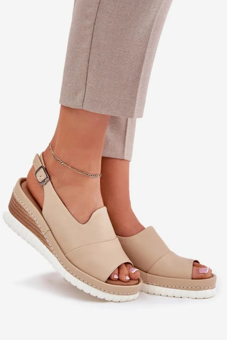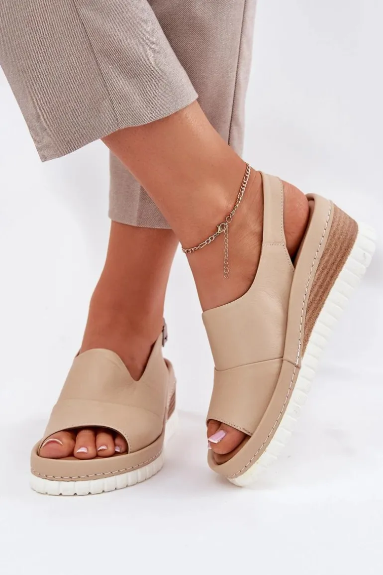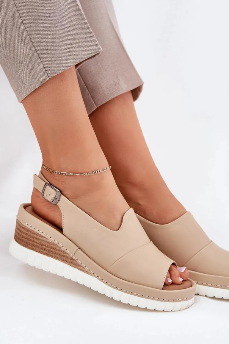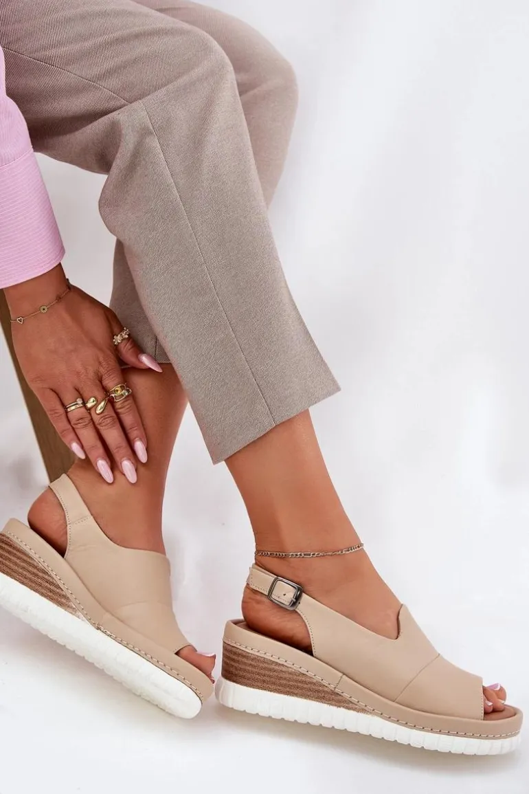 Damskie sandały z naturalnej skóry to elegancka opcja na ciepłe dni. Osadzone na koturnie, zapewniają stabilność i komfort przez cały dzień. Zapinane na klamrę z regulowanym paskiem, pozwalają na idealne dopasowanie do stopy. Miękka wkładka gwarantuje wygodę, a klasyczny fason sprawia, że te sandały będą doskonałym wyborem do sukienek i spodni materiałowych, nadając stylizacji lekkości i elegancji. Przy wyborze rozmiaru prosimy sugerować się tabelą rozmiarów.