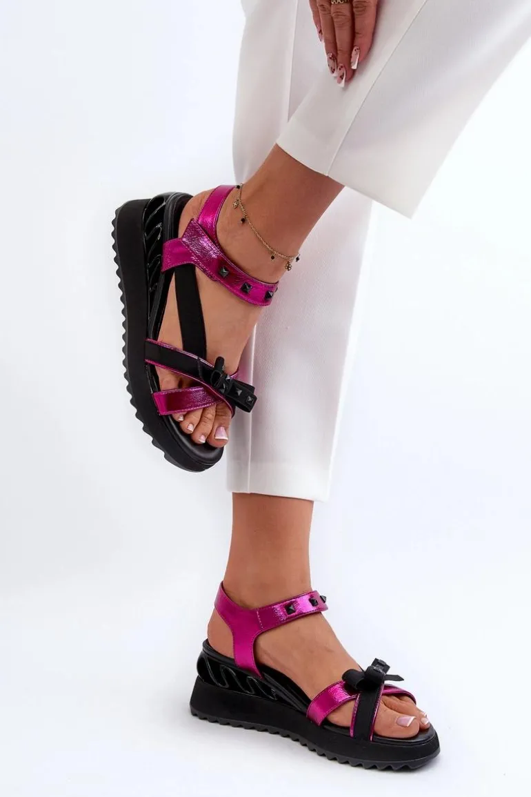 Niezwykle stylowe sandały damskie osadzone na platformie z koturnem. Praktyczne zapinanie na rzep zapewnia szybkie i wygodne dopasowanie do stopy. Kokardka z przodu nadaje im uroku i delikatności. Model ten pewnością przyciągnie spojrzenia! Przy wyborze rozmiaru prosimy sugerować się tabelą rozmiarów.