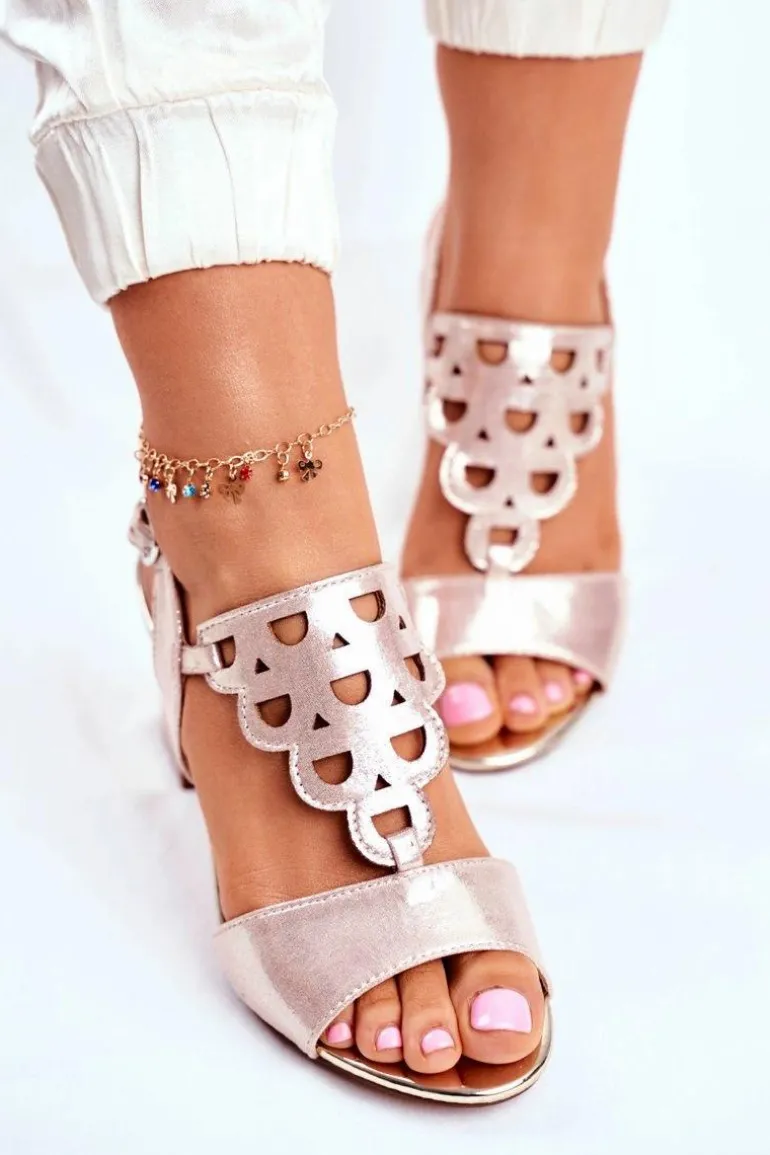 Klasyczne a zarazem eleganckie sandały, które sprawdzą się w każdej codziennej sytuacji. Sandałki posiadają regulowane zapinanie na sprzączkę wokół kostki. Dzięki ażurowemu zdobieniu oraz delikatnemu brokatowi będą idealnym dopełnieniem naszych stylizacji. Stabilny, niski słupek uniesie i subtelnie podkreśli naszą sylwetkę. Postaw na sprawdzony styl i kreuj trendy tego sezonu! Przy wyborze rozmiaru prosimy sugerować się tabelą rozmiarów.