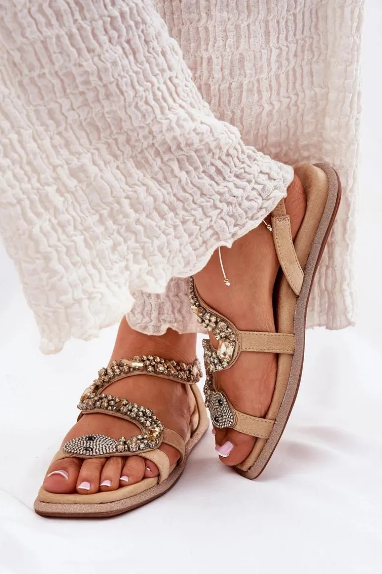 Sandały damskie wykonane z eko skóry to idealny wybór na letnie dni. Płaska podeszwa ozdobiona brokatem dodaje im subtelnego blasku, a unikalne kryształki, które tworzą kształt węża, nadają im wyjątkowego charakteru. Te sandały będą doskonałym akcentem do letnich stylizacji, łącząc elegancję z modnym, oryginalnym wyglądem. Przy wyborze rozmiaru prosimy sugerować się tabelą rozmiarów.