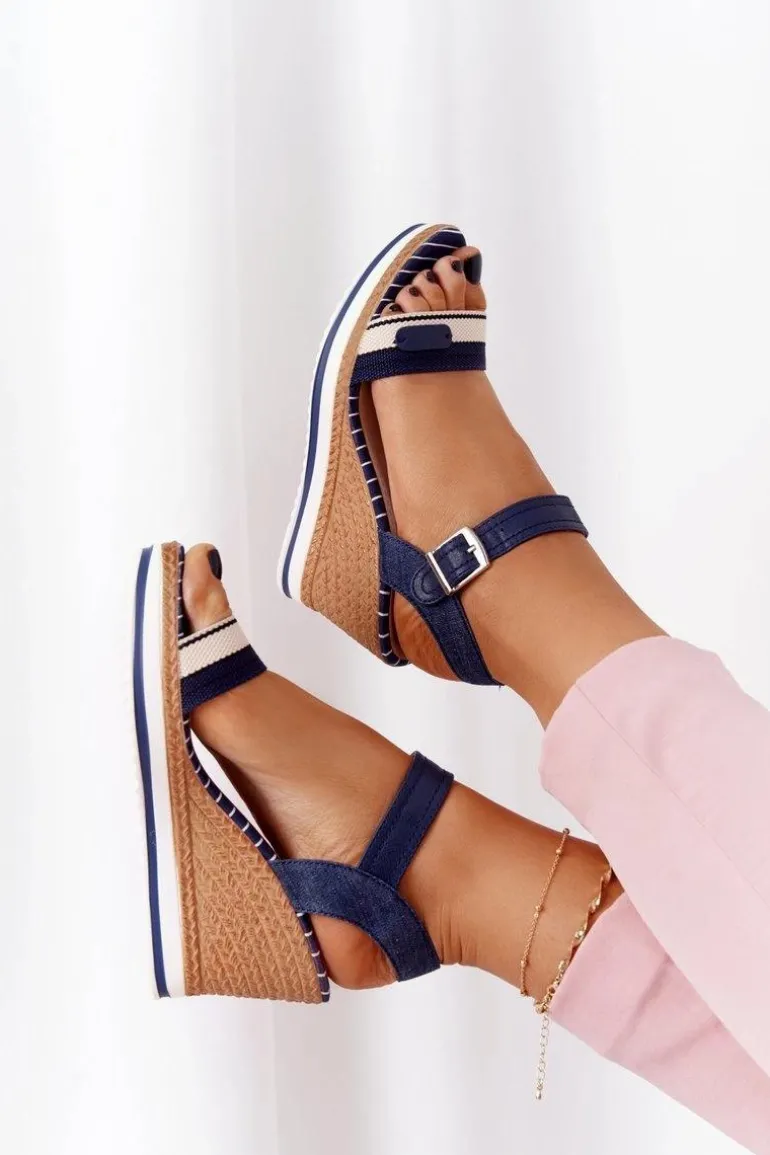 Piękne oraz wygodne sandały na koturnie wykonane z połączenia eko skóry, oraz tkaniny. Buty posiadają miękką wkładkę ze skóry ekologicznej. Modny fason w marynarskim stylu urozmaici Twoją letnią garderobę! Koniecznie sprawdź całą naszą kolekcję damskich sandałów. Przy wyborze rozmiaru prosimy sugerować się tabelą rozmiarów.