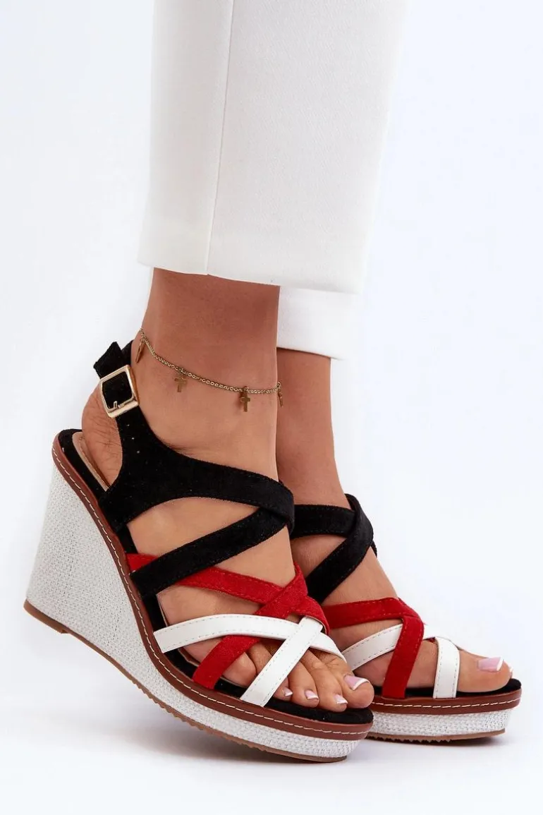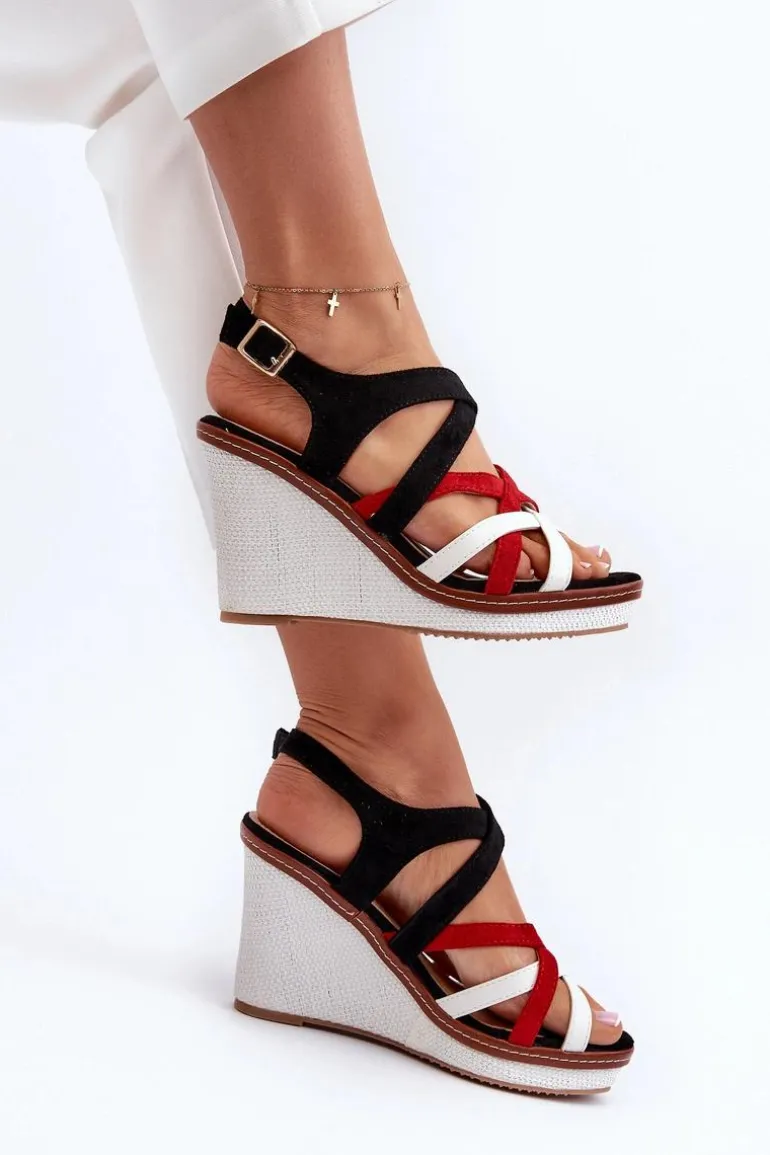 Wyjątkowe sandały damskie na platformie i koturnie. Cholewka została wykonana z eko skóry. Paseczki przeplatają się ze sobą tworząc wyjątkowy efekt. Buty posiadają miękką, eko skórzaną wkładkę. Sandałki są zapinane wokół kostki na sprzączkę z regulowanym paskiem. Podeszwa wykonana z tworzywa sztucznego jest antypoślizgowa, natomiast koturn wraz z platformą zostały ozdobione plecionką. Przy wyborze rozmiaru prosimy sugerować się tabelą rozmiarów.
