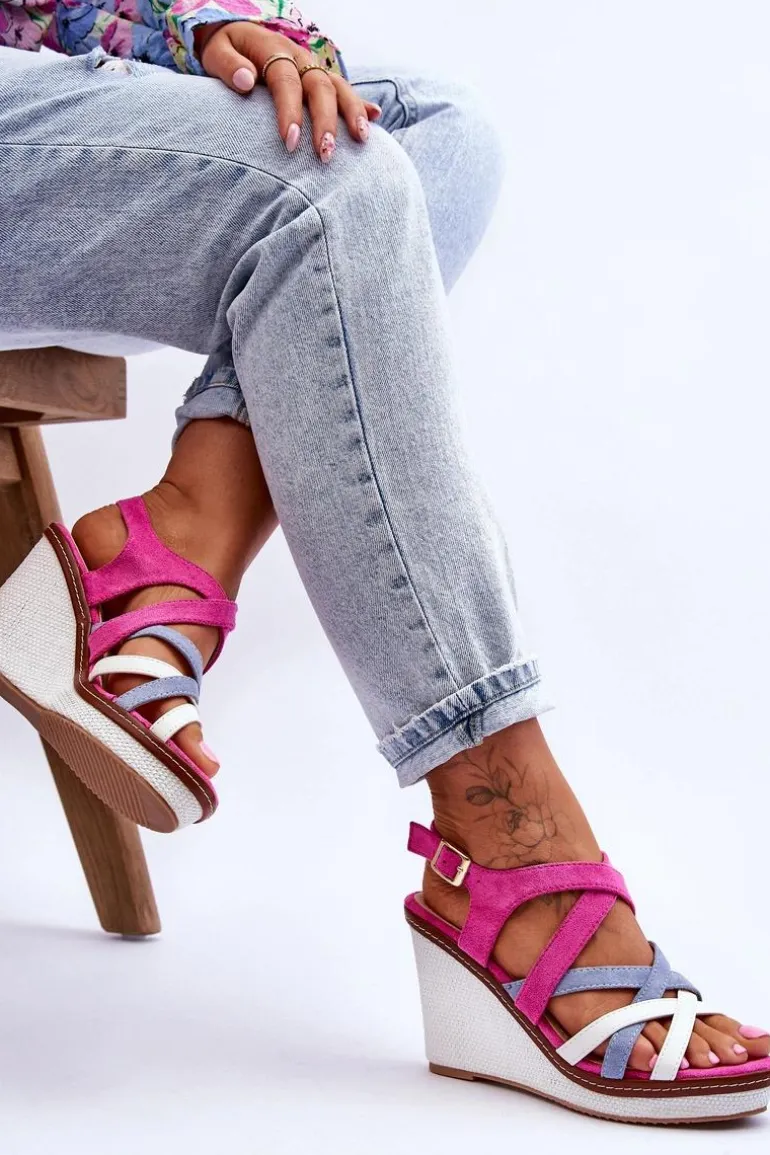 Wyjątkowe sandały damskie na platformie i koturnie. Cholewka została wykonana z eko skóry. Paseczki przeplatają się ze sobą tworząc wyjątkowy efekt. Buty posiadają miękką, eko skórzaną wkładkę. Sandałki są zapinane wokół kostki na sprzączkę z regulowanym paskiem. Podeszwa wykonana z tworzywa sztucznego jest antypoślizgowa, natomiast koturn wraz z platformą zostały ozdobione plecionką. Przy wyborze rozmiaru prosimy sugerować się tabelą rozmiarów.
