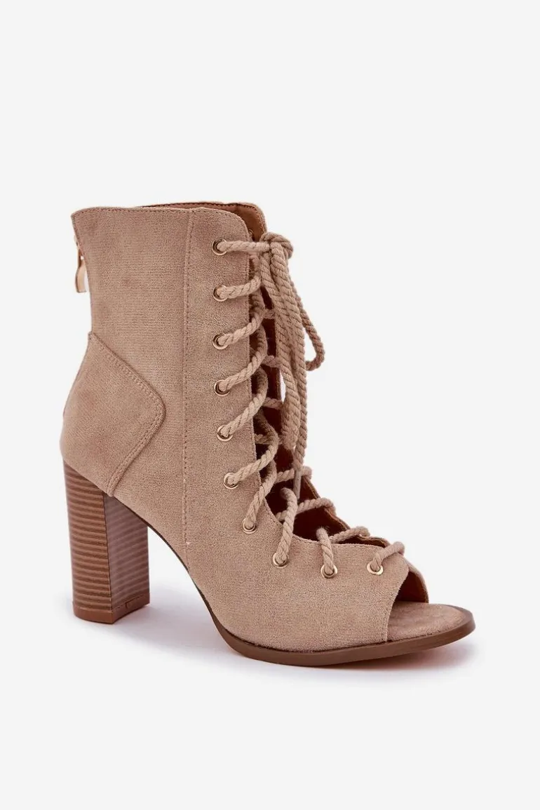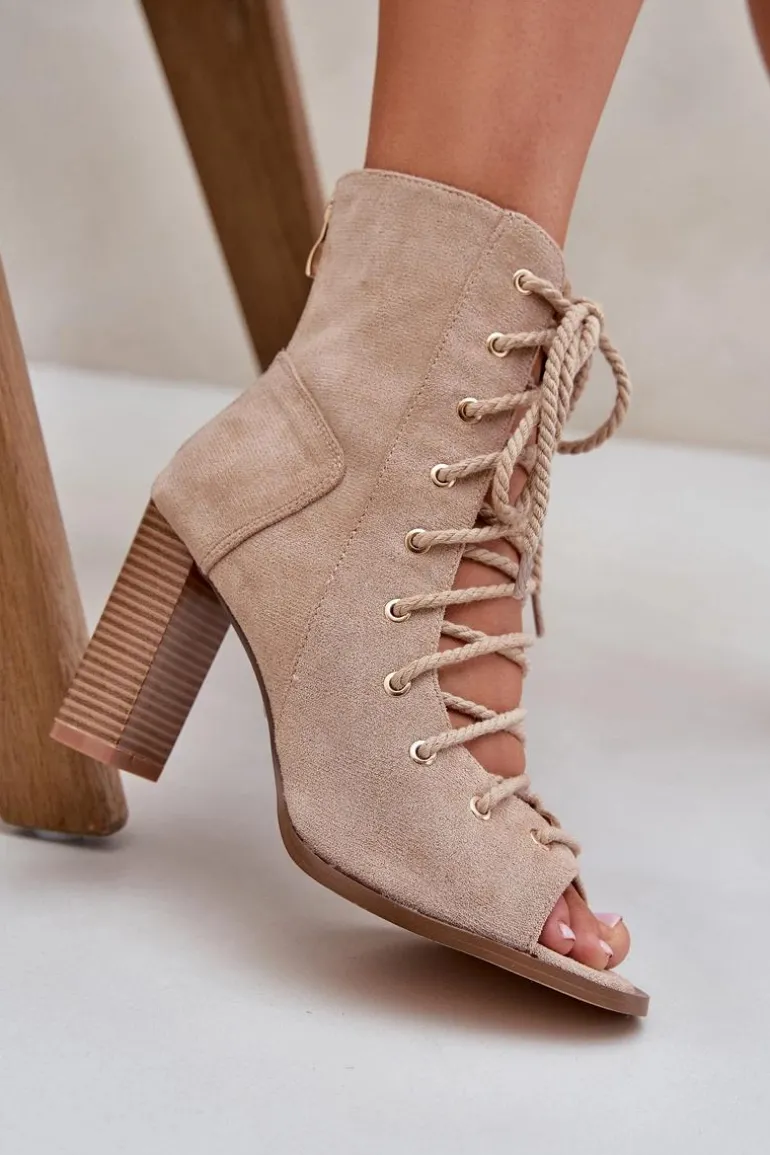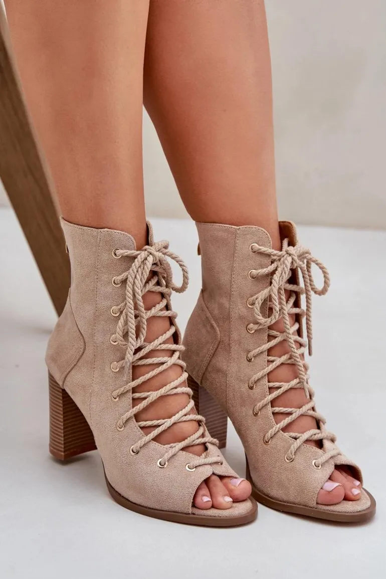Sandały damskie z eko zamszu to elegancka propozycja na ciepłe dni. Osadzone na obcasie słupku, który zapewnia stabilność i wygodę. Sznurowana cholewka dodaje im nowoczesnego, a zarazem kobiecego charakteru, natomiast z tyłu znajdujące się zapięcie na zamek ułatwia ich zakładanie i zdejmowanie. Te sandały świetnie komponują się w letnich stylizacjach, łącząc styl, komfort i funkcjonalność. Przy wyborze rozmiaru prosimy sugerować się tabelą rozmiarów.