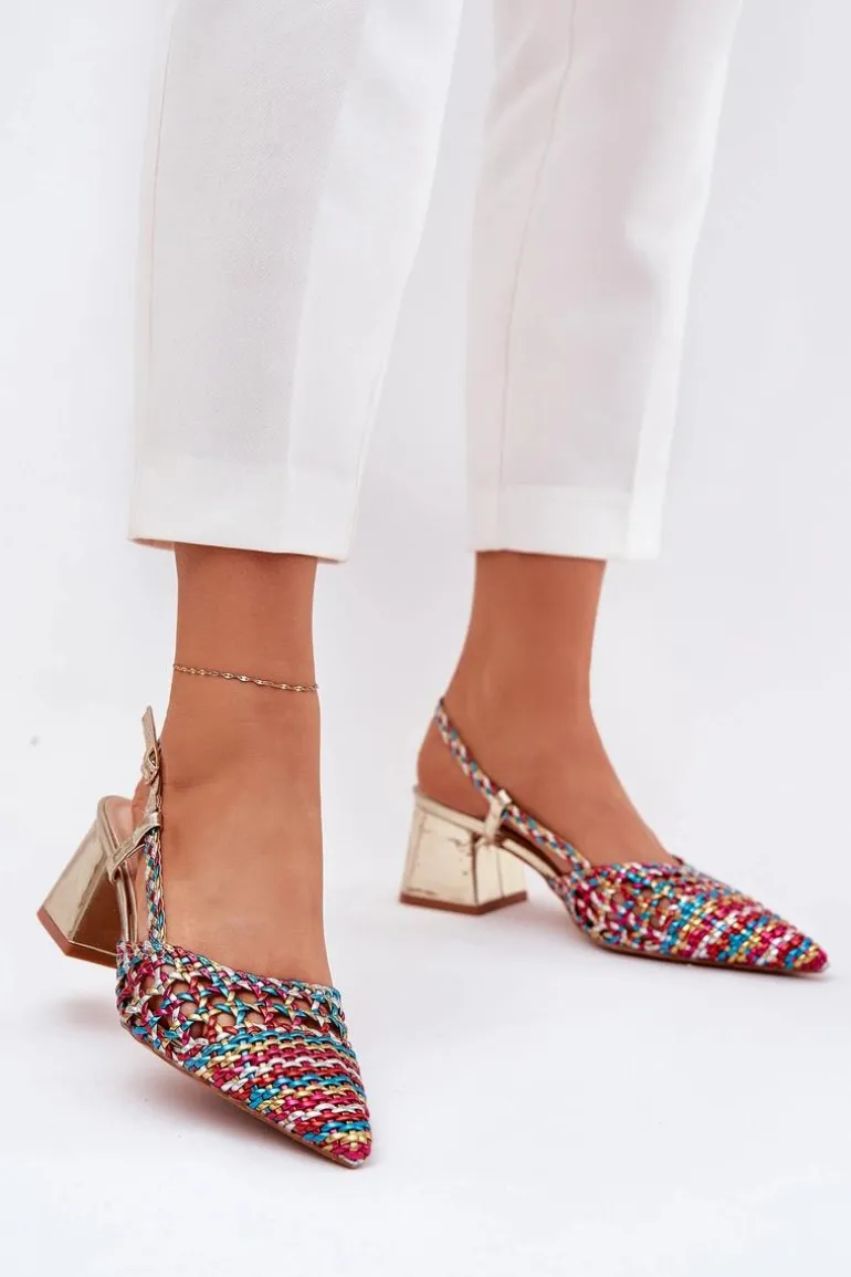 Sandały damskie z plecionki, osadzone na obcasie typu słupek. Szpiczaste noski nadają subtelnej elegancji, a zapinane na sprzączkę pozwalają na idealne dopasowanie do stopy. Miękka wkładka z eko skóry zapewnia komfort przez cały dzień. Te sandały będą doskonałym wyborem na letnie dni, świetnie komponując się z sukienkami, spódnicami czy spodniami, dodając każdej stylizacji wyjątkowego charakteru. Przy wyborze rozmiaru prosimy sugerować się tabelą rozmiarów.