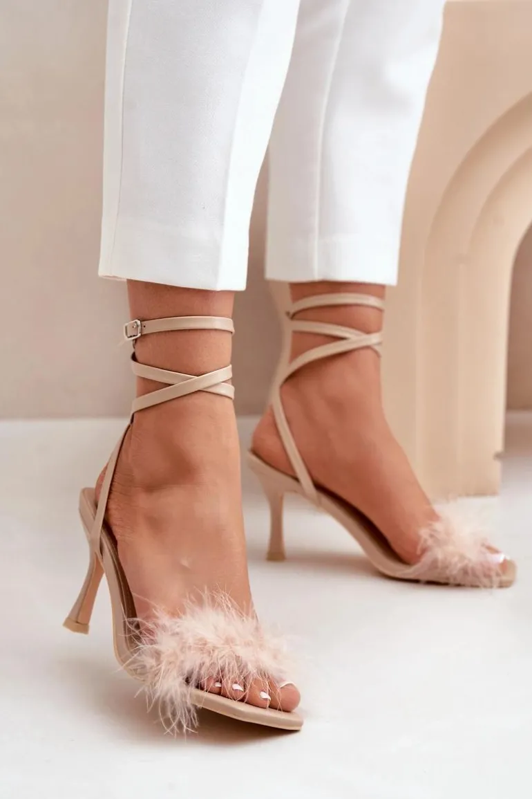 Stylowe damskie sandały wykonane z eko skóry, idealne na wyjątkowe okazje. Osadzone na eleganckiej szpilce, wyróżniają się ozdobą w formie delikatnych piór z przodu, które dodają lekkości i wyrafinowanego stylu. Zapinane na regulowany pasek ze sprzączką, zapewniają idealne dopasowanie do stopy. To oryginalny wybór, który świetnie uzupełni wieczorowe i koktajlowe stylizacje, przyciągając uwagę niepowtarzalnym designem. Przy wyborze rozmiaru prosimy sugerować się tabelą rozmiarów.