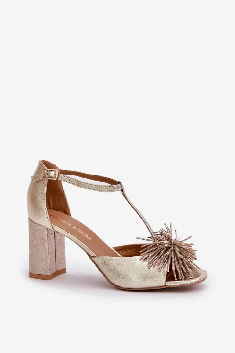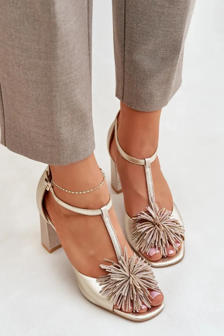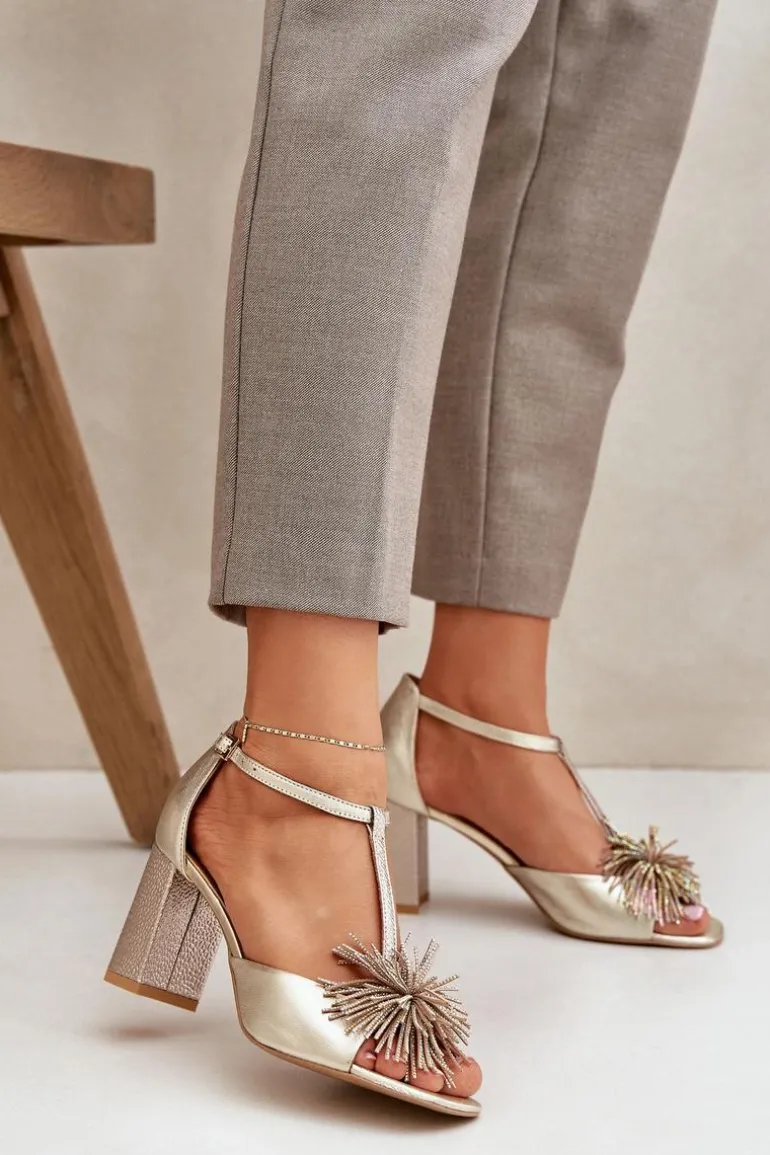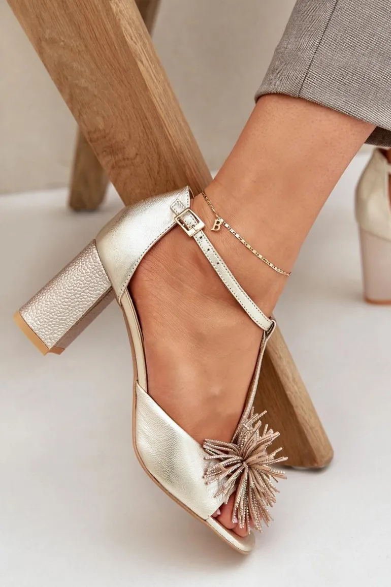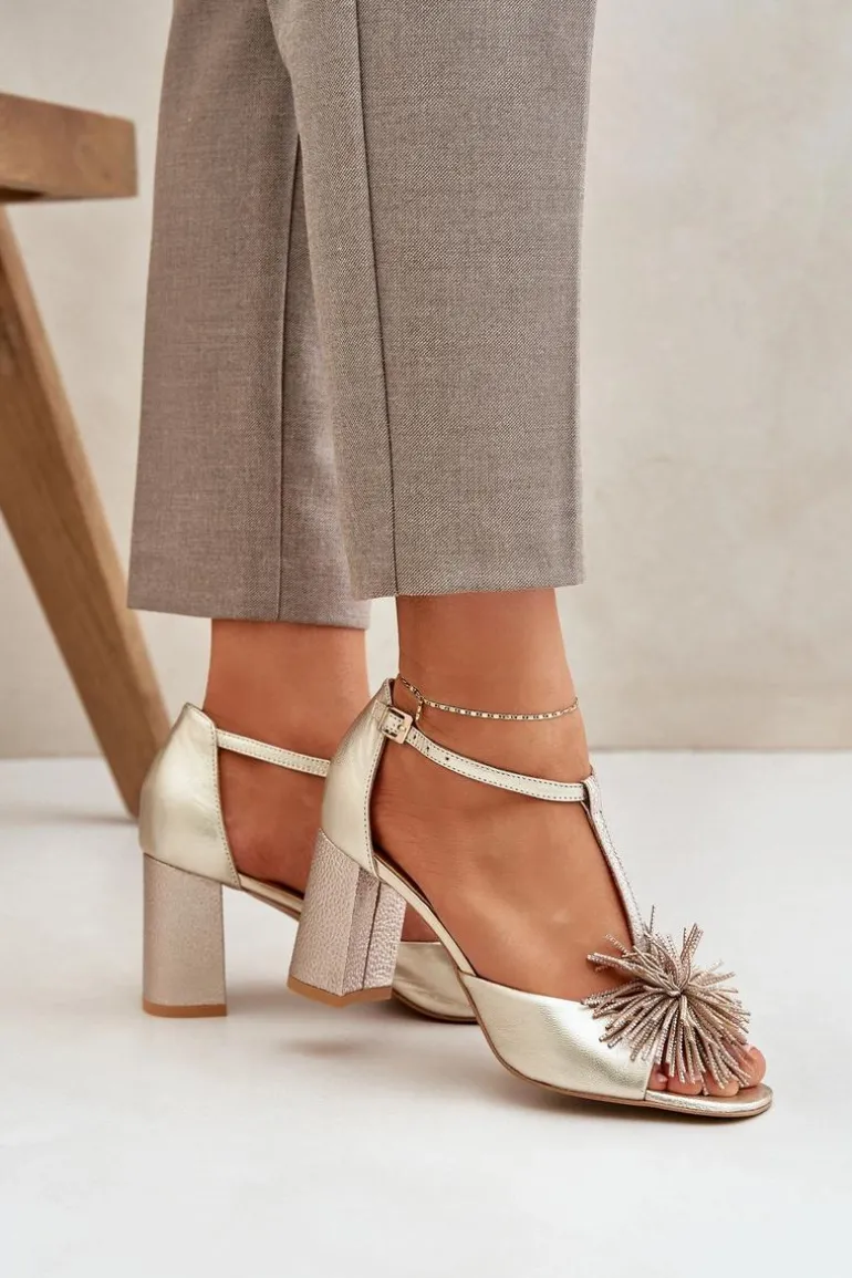Sandały damskie wykonane ze skóry naturalnej. Osadzone na obcasie w postaci słupka. Zapinane na regulowany paseczek ze sprzączką. Model z zakrytą piętą. Z przodu ozdoba. Skórzana wkładka zapewni wygodę podczas użytkowania. Fason ten dopasujesz do eleganckich spodni, spódnic i sukienek. Przy wyborze rozmiaru prosimy sugerować się tabelą rozmiarów.