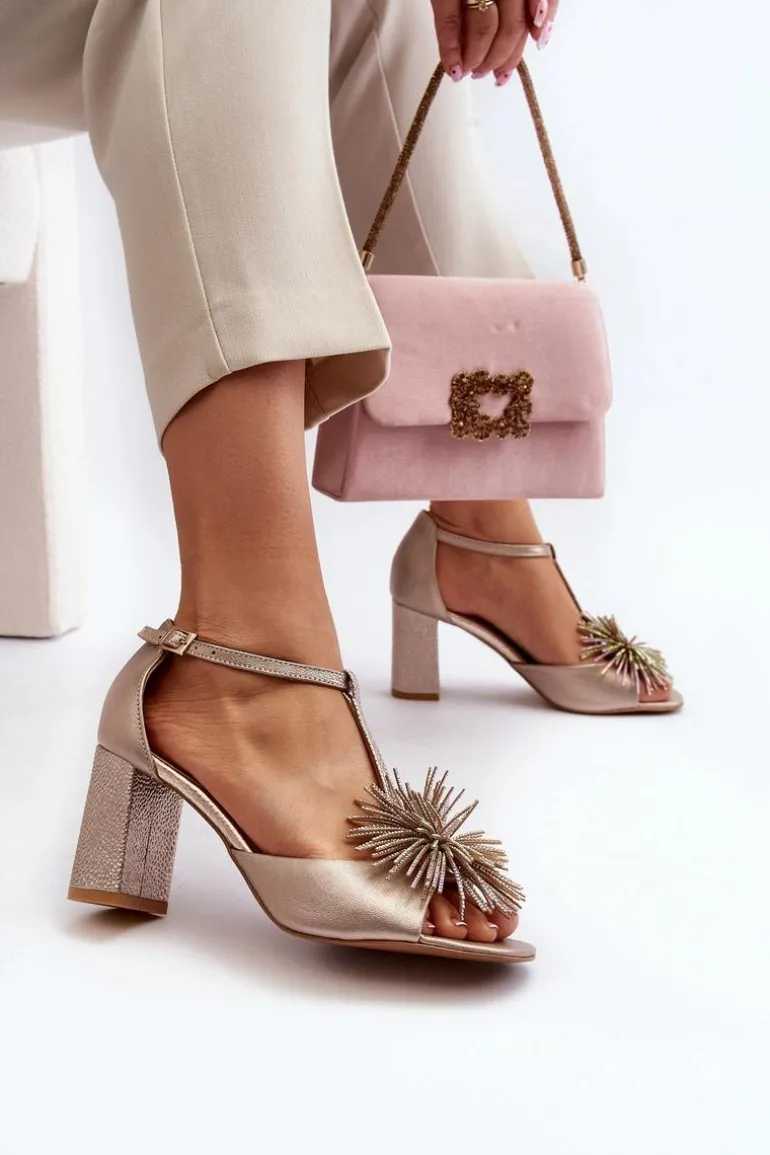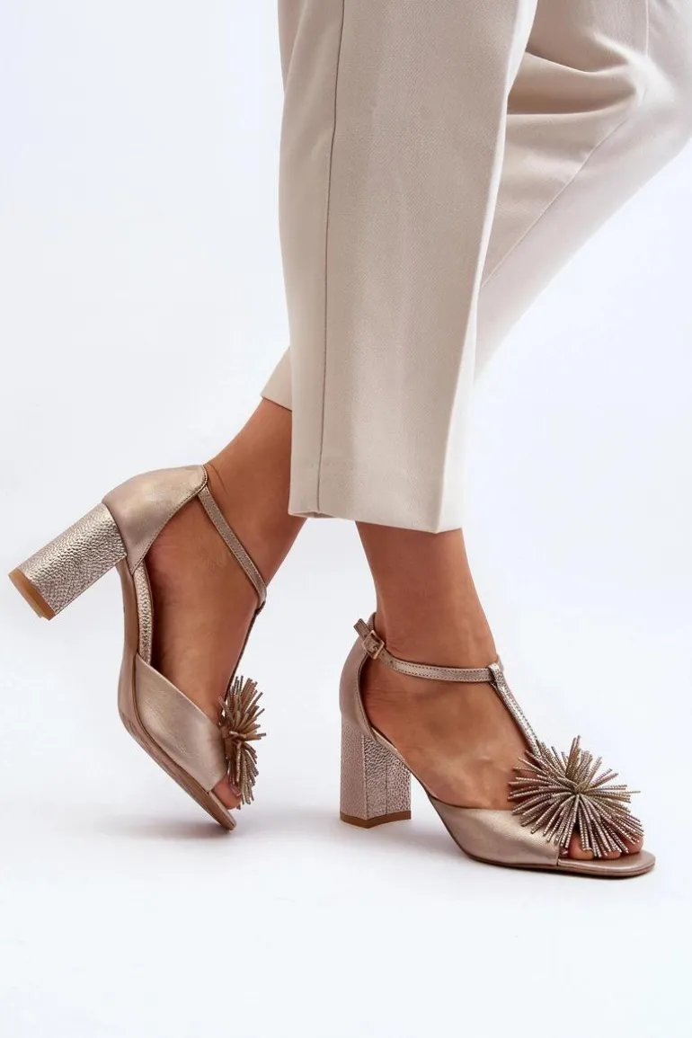 Sandały damskie wykonane ze skóry naturalnej. Osadzone na obcasie w postaci słupka. Zapinane na regulowany paseczek ze sprzączką. Model z zakrytą piętą. Z przodu ozdoba. Skórzana wkładka zapewni wygodę podczas użytkowania. Fason ten dopasujesz do eleganckich spodni, spódnic i sukienek. Przy wyborze rozmiaru prosimy sugerować się tabelą rozmiarów.