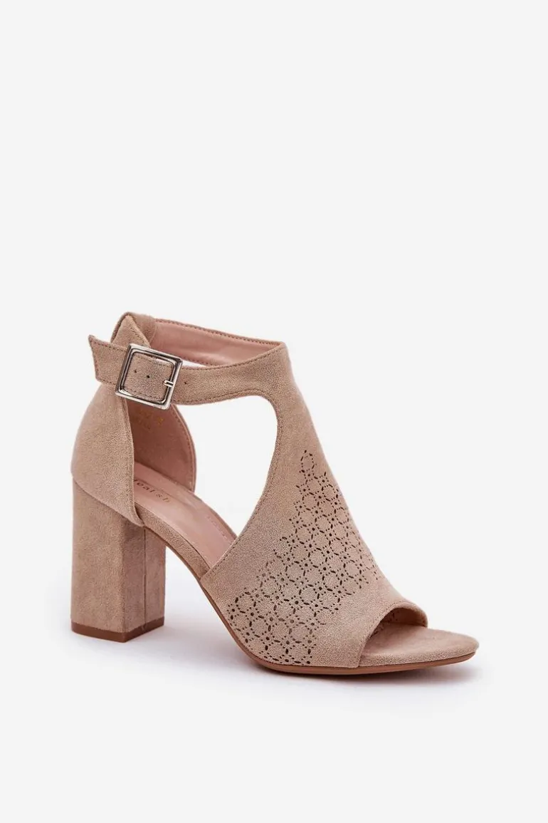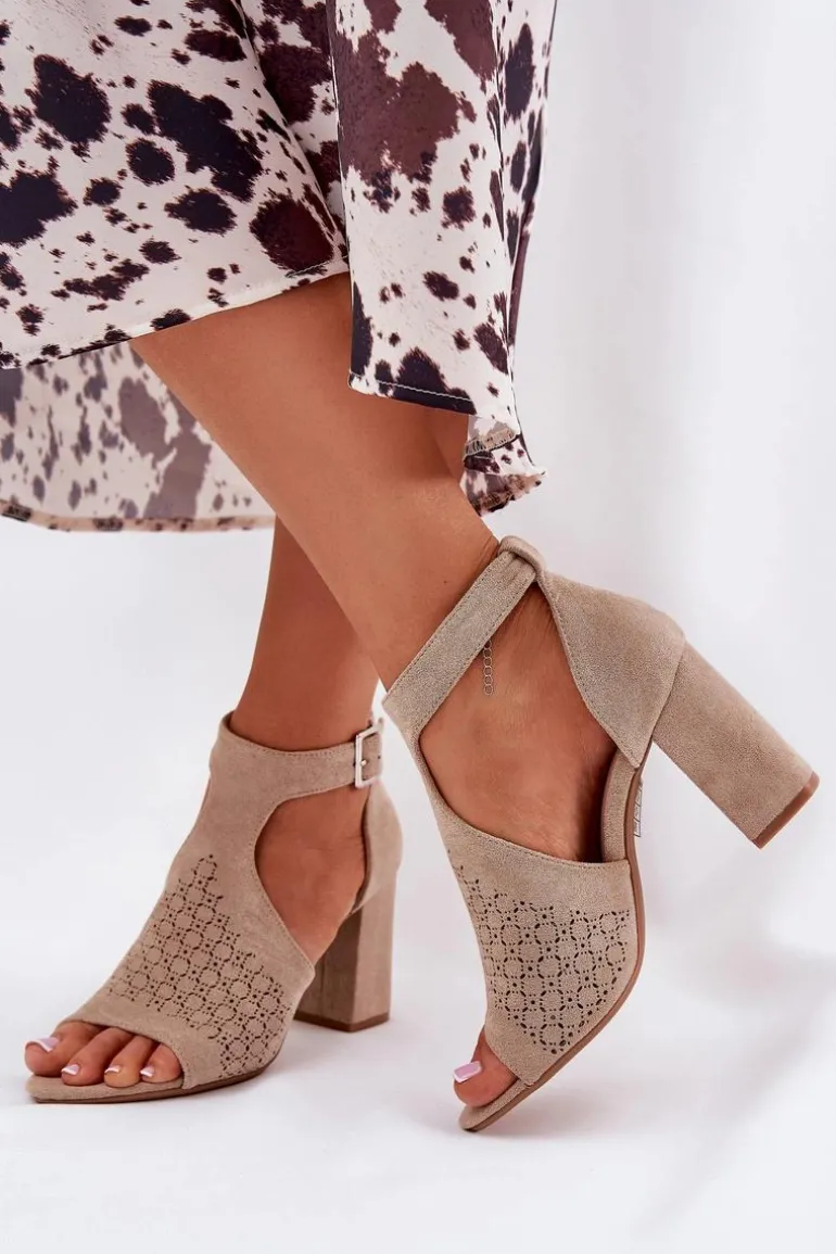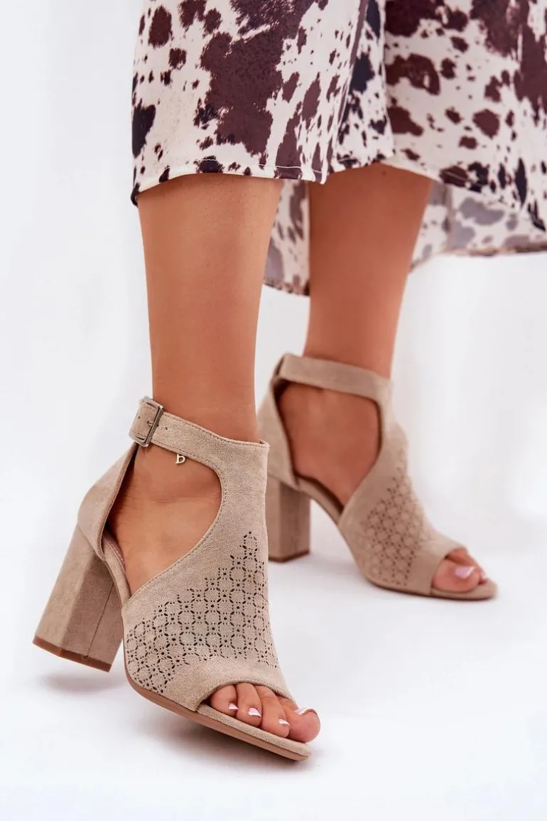 Sandały damskie z eko zamszu, ozdobione subtelnym ażurowym wzorem. Osadzone na stabilnym obcasie w formie słupka, zapewniają wygodę i elegancki wygląd. Model zapinany na sprzączkę, doskonale sprawdzi się na różne okazje. Przy wyborze rozmiaru prosimy sugerować się tabelą rozmiarów.