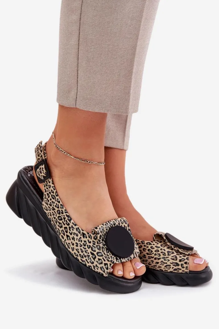 Eleganckie i stylowe sandały z naturalnej skóry to doskonały wybór na letnie dni. Osadzone na koturnie, zapewniają komfort i stabilność przez cały dzień. Z przodu znajduje się nowoczesna, geometryczna ozdoba, która dodaje im wyjątkowego charakteru. Zapinane na klamrę z regulowanym paskiem, pozwalają na idealne dopasowanie do stopy. Skórzana wkładka gwarantuje wygodę, czyniąc te sandały idealnym wyborem do letnich stylizacji. Przy wyborze rozmiaru prosimy sugerować się tabelą rozmiarów.