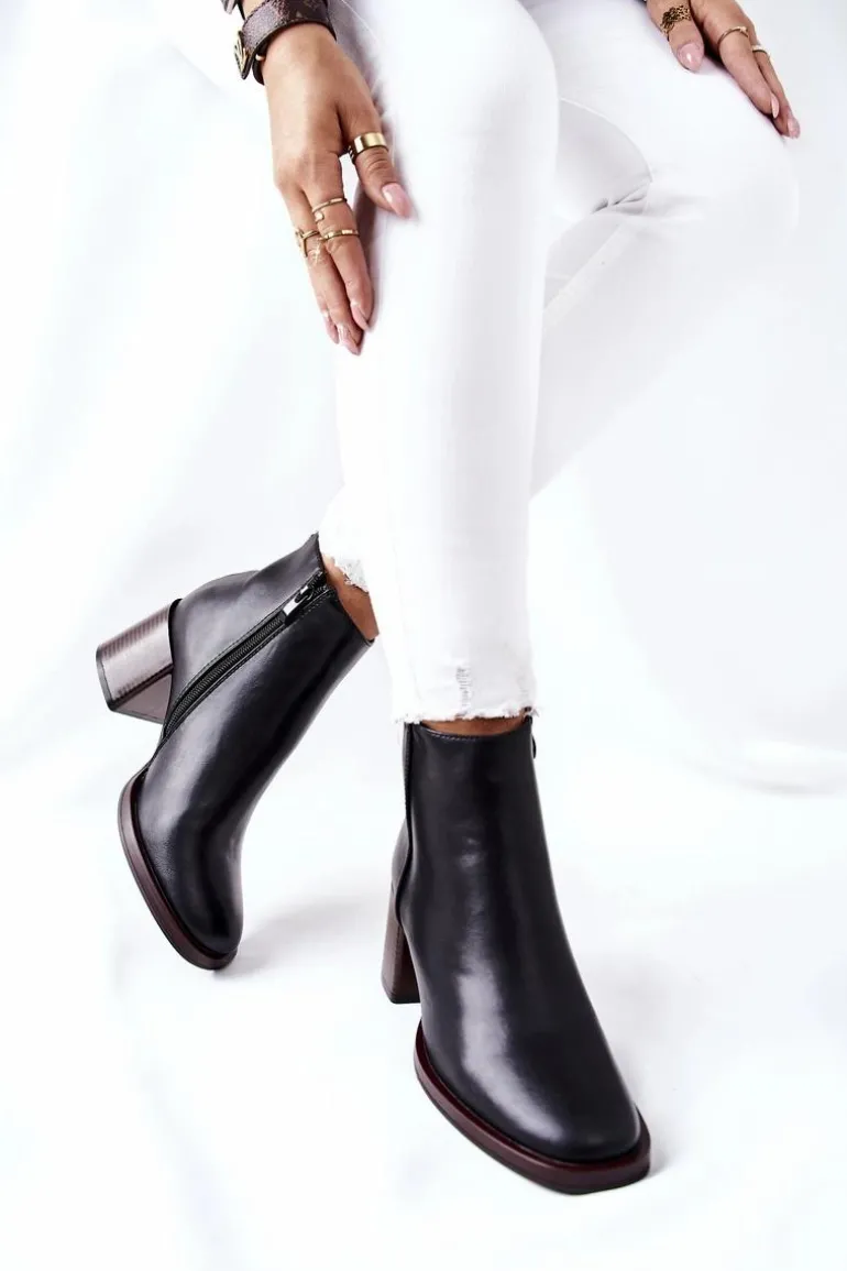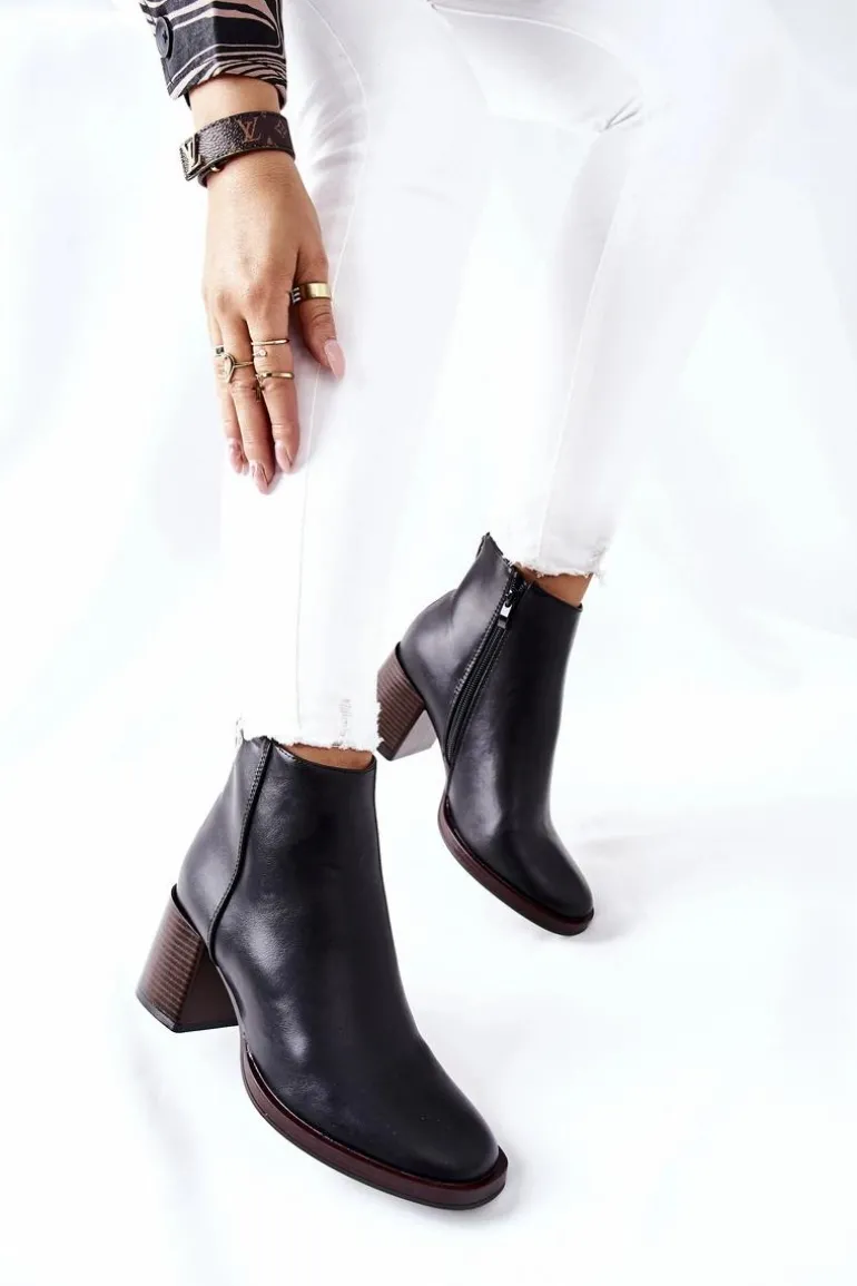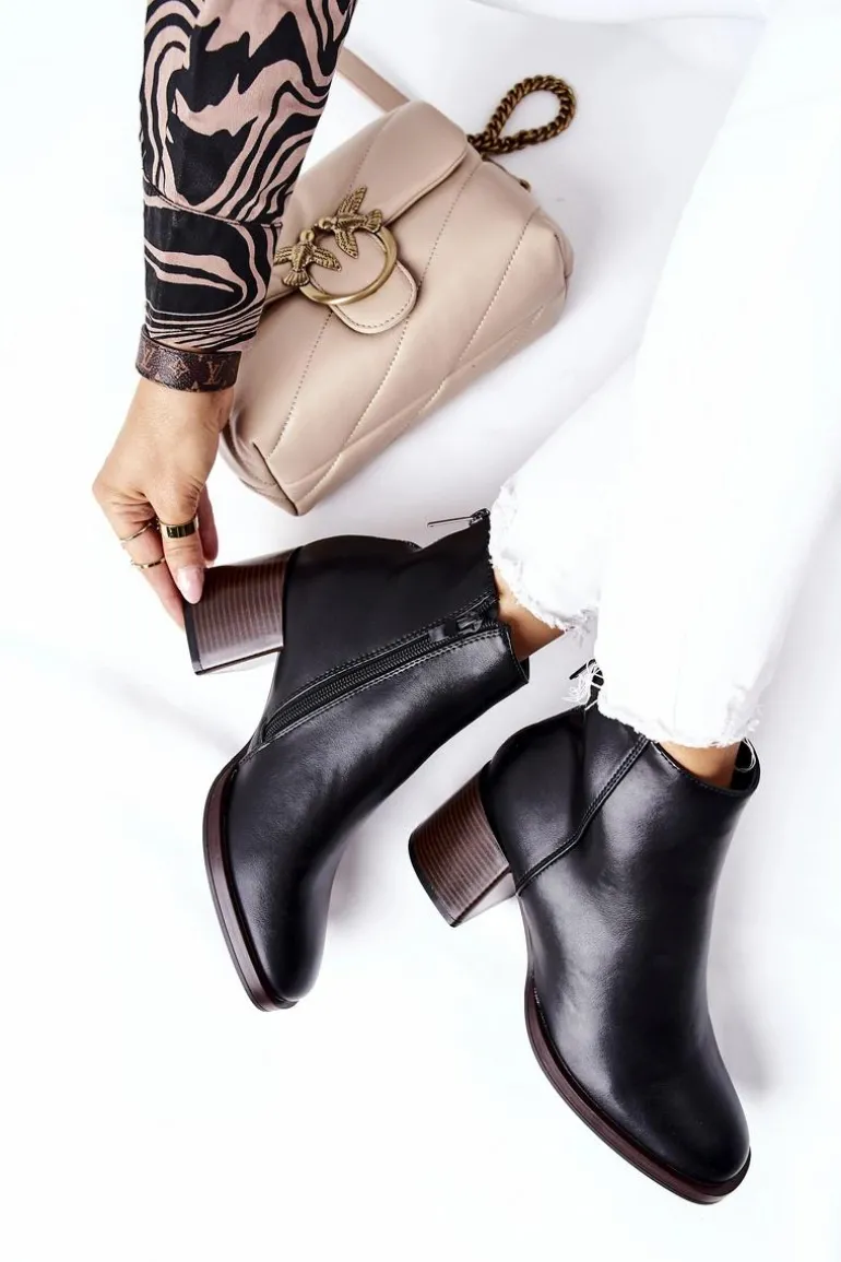 Botki wykonane ze skóry ekologicznej. Oparte na stabilnym słupku, który w połączeniu z delikatnym ociepleniem zagwarantuje nam komfort na każdym kroku. Zakładanie ułatwi wszyty na boku zamek. Dodatkowe zdobienie w postaci wstążki z tyłu.