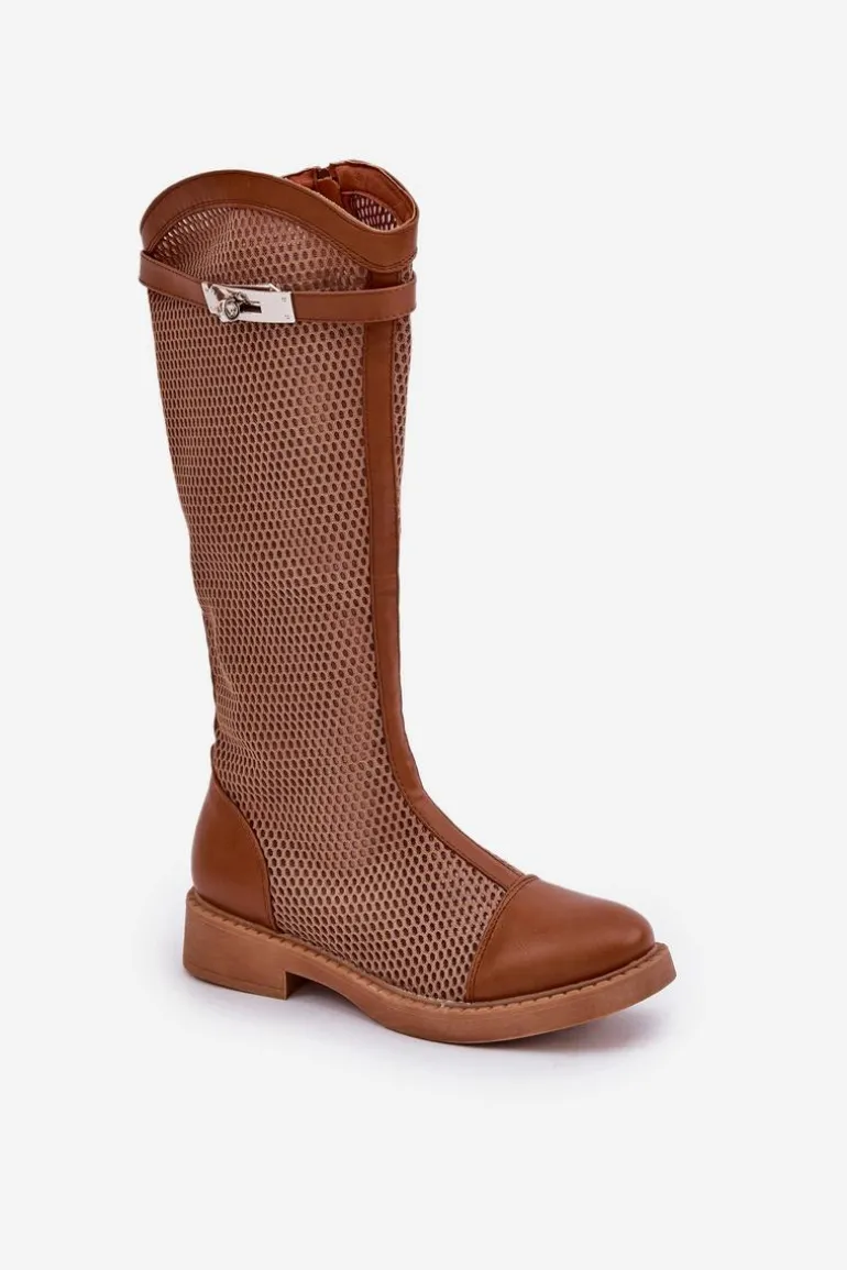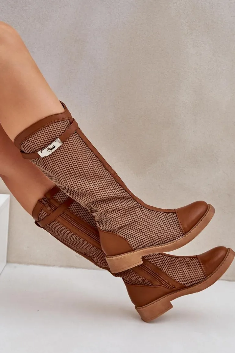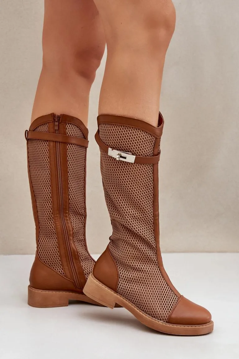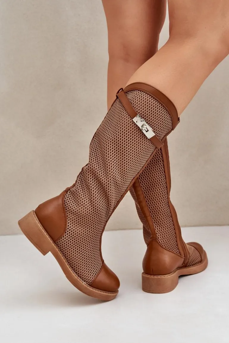 Kozaki z siateczkową cholewką to stylowa i kobieca propozycja na sezon wiosenno-letni. Wykonane z połączenia eko skóry i tkaniny. Zaokrąglone noski zapewniają wygodę noszenia. Obuwie zapinane na zamek, co ułatwia zakładanie i zdejmowanie. Na górze ozdobny paseczek. Sięgające do połowy łydki, doskonale komponują się z różnymi stylizacjami. Przy wyborze rozmiaru prosimy sugerować się tabelą rozmiarów.
