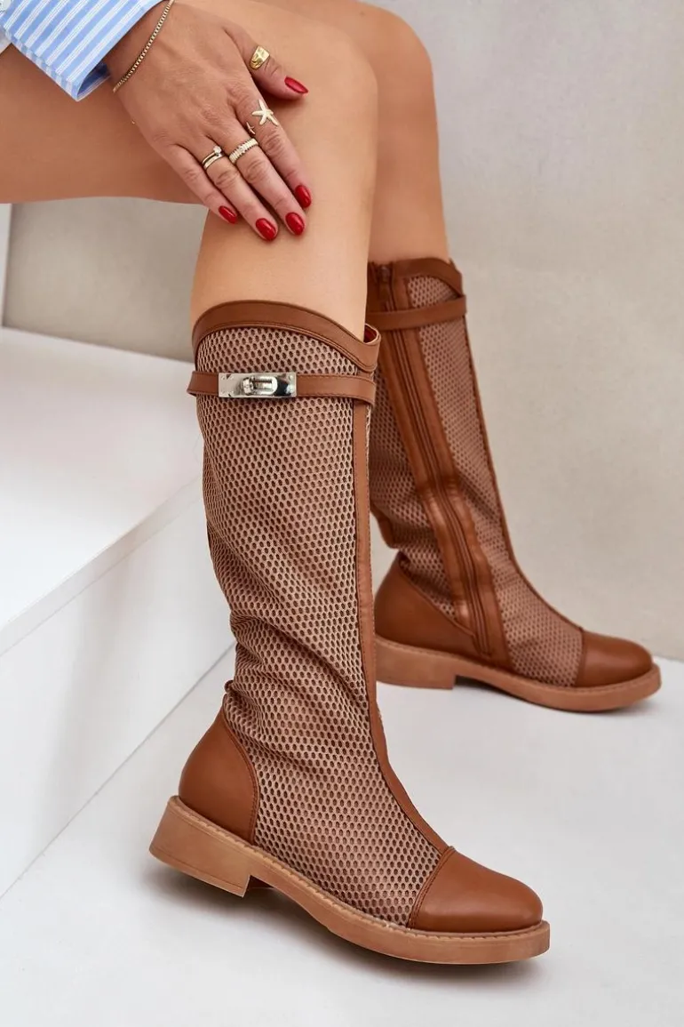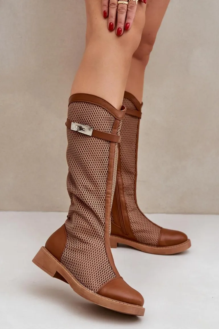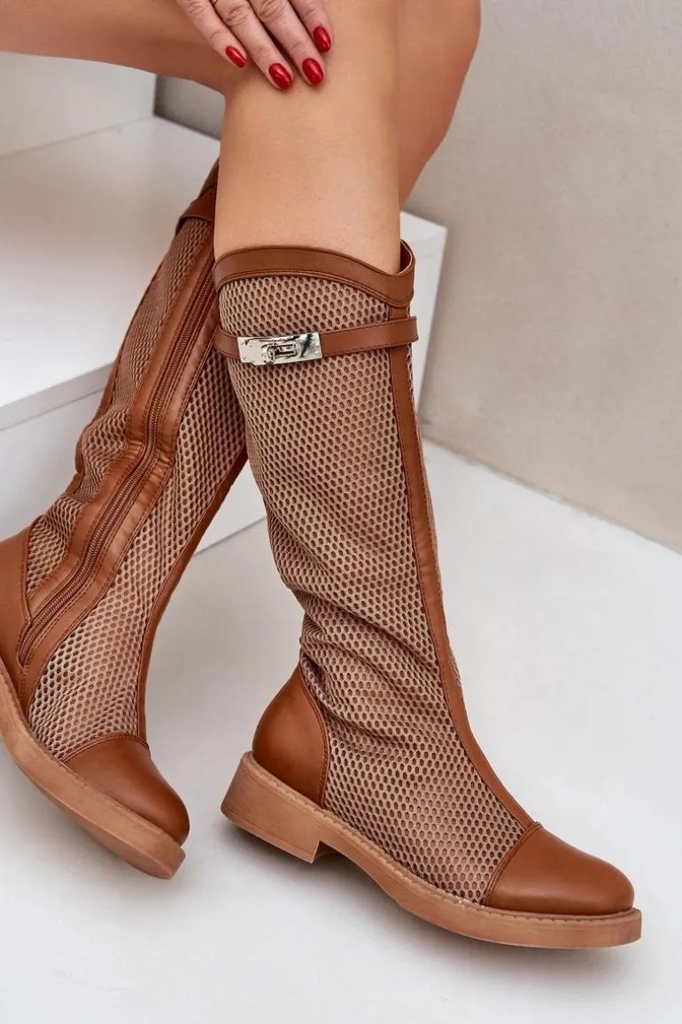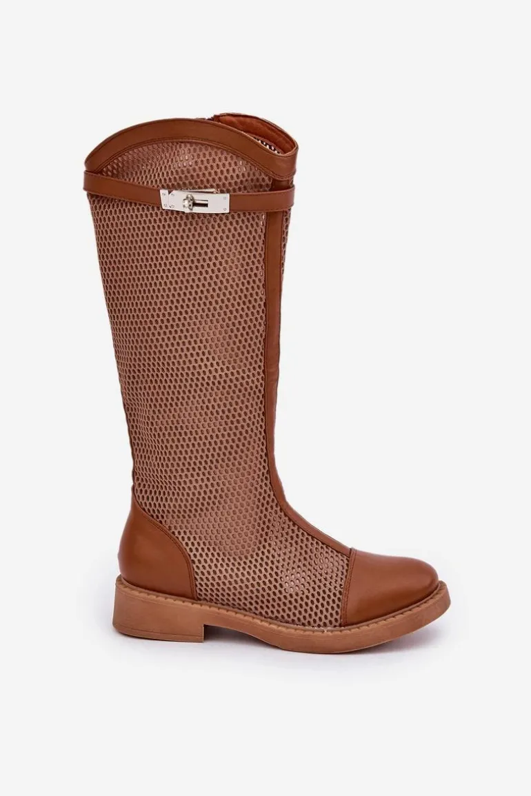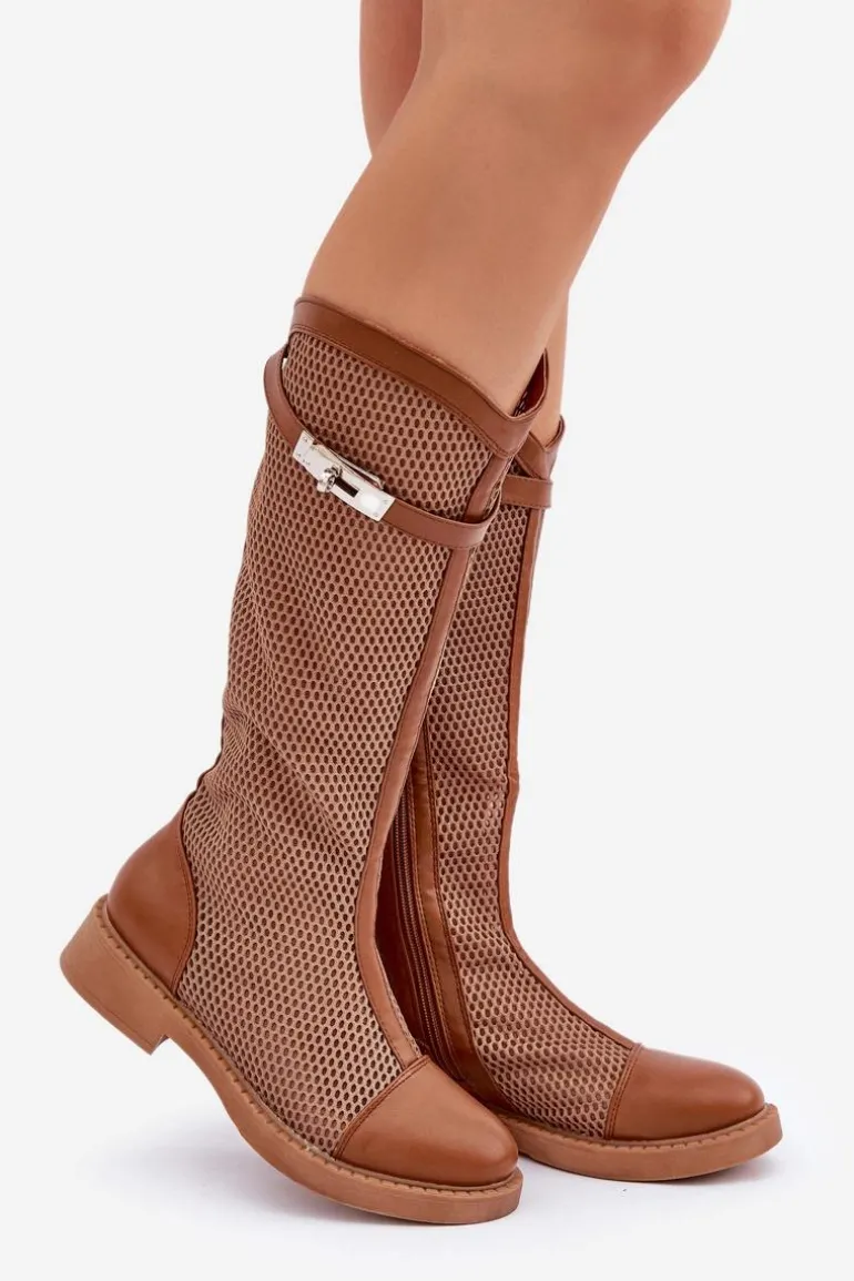 Kozaki z siateczkową cholewką to stylowa i kobieca propozycja na sezon wiosenno-letni. Wykonane z połączenia eko skóry i tkaniny. Zaokrąglone noski zapewniają wygodę noszenia. Obuwie zapinane na zamek, co ułatwia zakładanie i zdejmowanie. Na górze ozdobny paseczek. Sięgające do połowy łydki, doskonale komponują się z różnymi stylizacjami. Przy wyborze rozmiaru prosimy sugerować się tabelą rozmiarów.