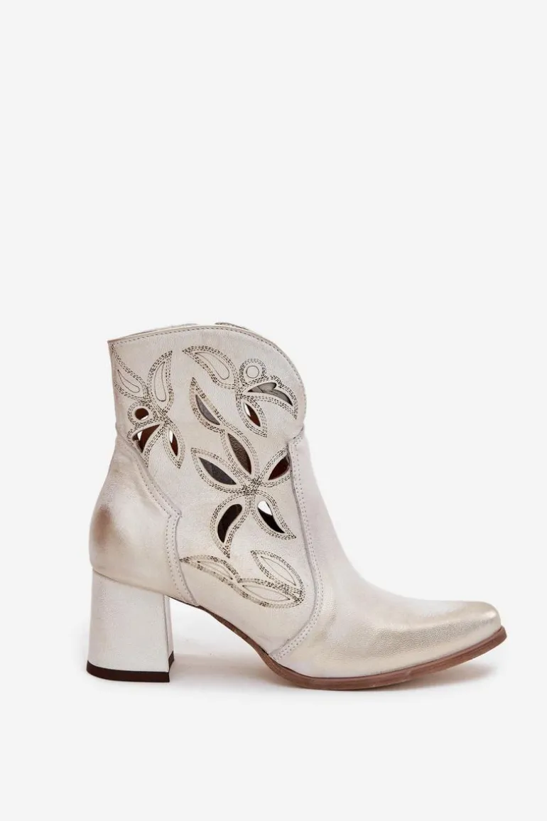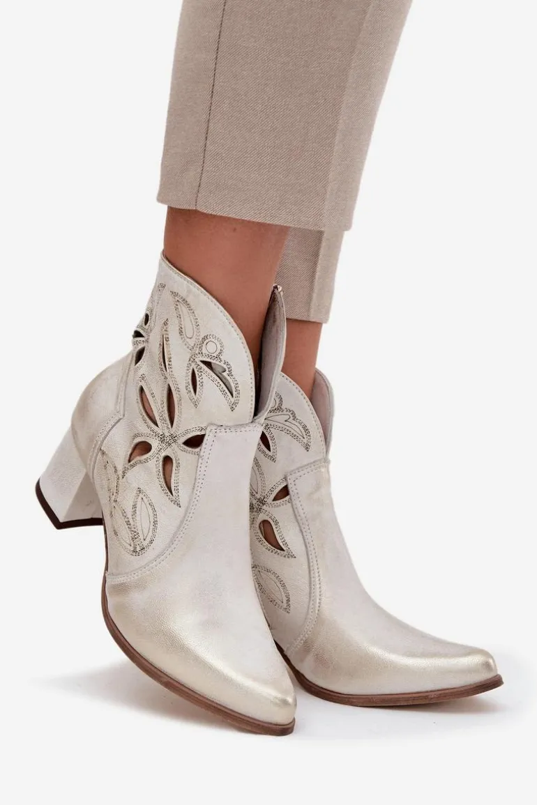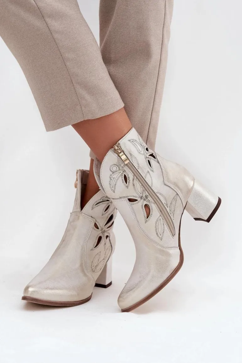 Skórzane Ażurowe Botki Damskie Na Słupku Zazoo 3647 Złoty Przecierany
