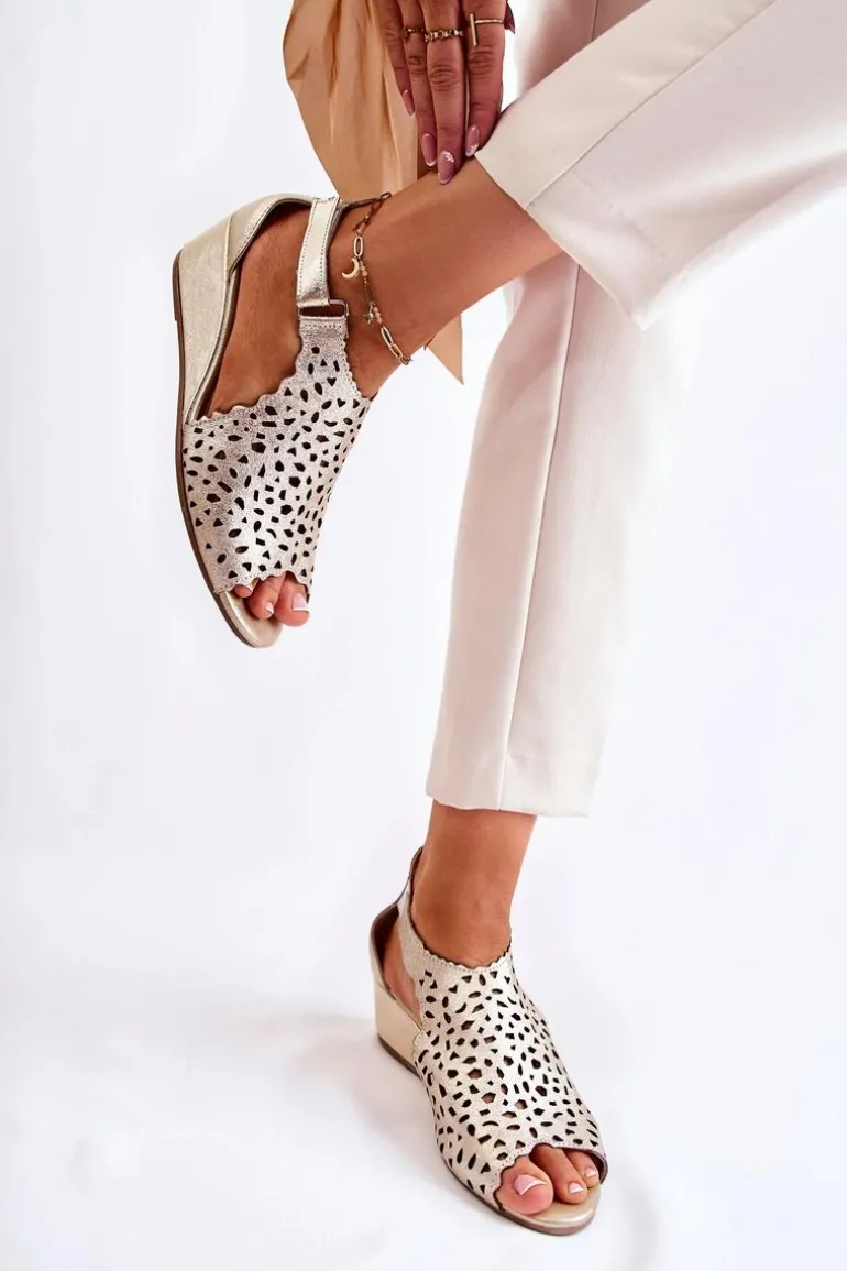 Sandały damskie wykonane z naturalnej skóry w ażurowy wzór. Zapinane przy kostce na rzep. Dodatkowo znajduje się także gumka przy usztywnianym zapiętku, co pozwoli na odpowiednie dopasowanie obuwia. Buty są osadzone na koturnie. Sandały posiadają odkryty, zaokrąglony nosek. Miękka wkładka wykonana także z naturalnej skóry pozwoli na wygodne użytkowanie obuwia. Fason idealny na upalne dni! Przy wyborze rozmiaru prosimy sugerować się tabelą rozmiarów.