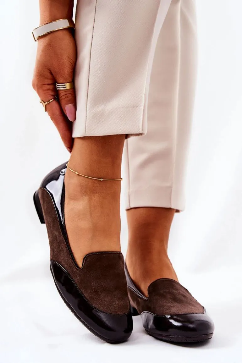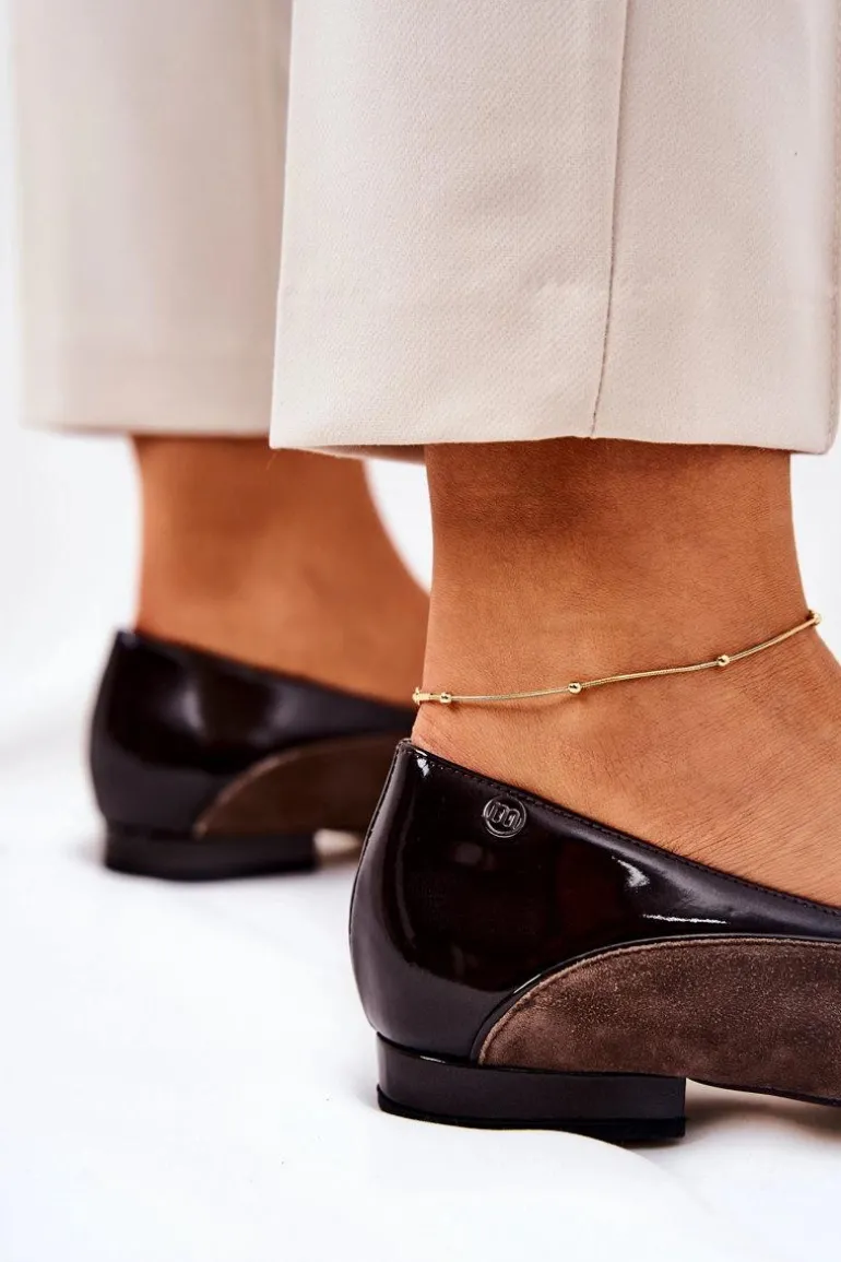 Baleriny to niewątpliwie jedne z najwygodniejszych butów, które pasują do wielu stylizacji. Prezentowany model wykonany został z naturalnej skóry, częściowo lakierowanej. Baleriny są bardzo eleganckie, a dodatkowo bardzo wygodne. Modny wzór podkreśla ich wyjątkowy styl. Posiadają z boku ozdobny element. Wkładka skórzana, perforowana.Podczas wyboru rozmiaru prosimy sugerować się tabelą rozmiarów.