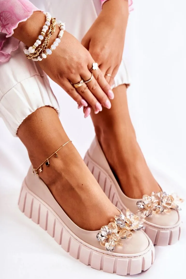 Skórzane Baleriny Na Platformie Z Ozdobą Beżowe Ladette