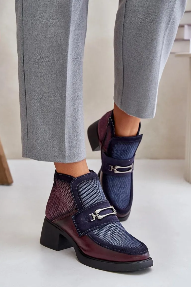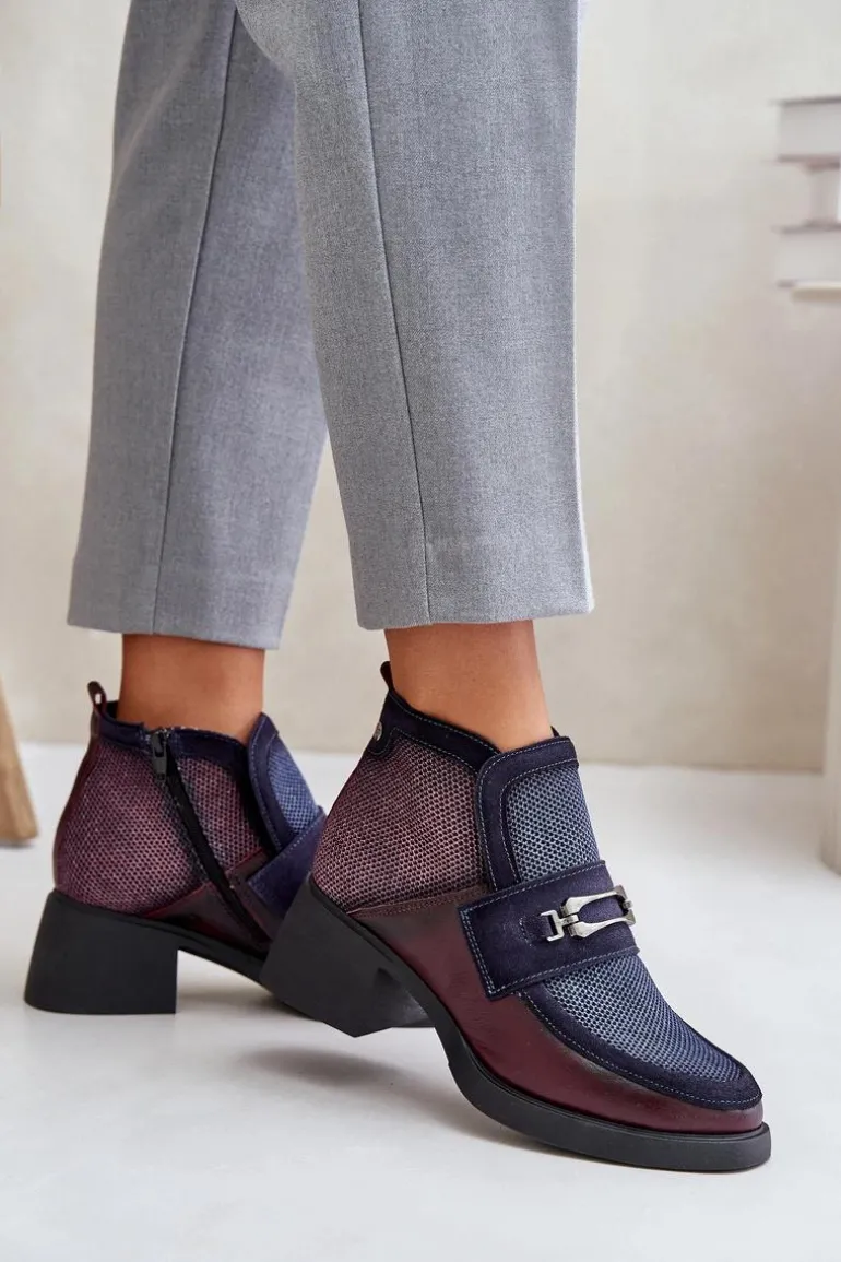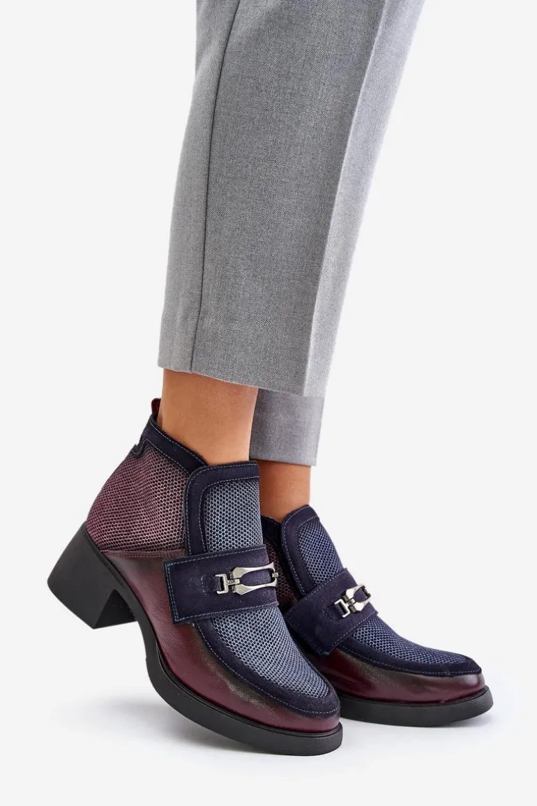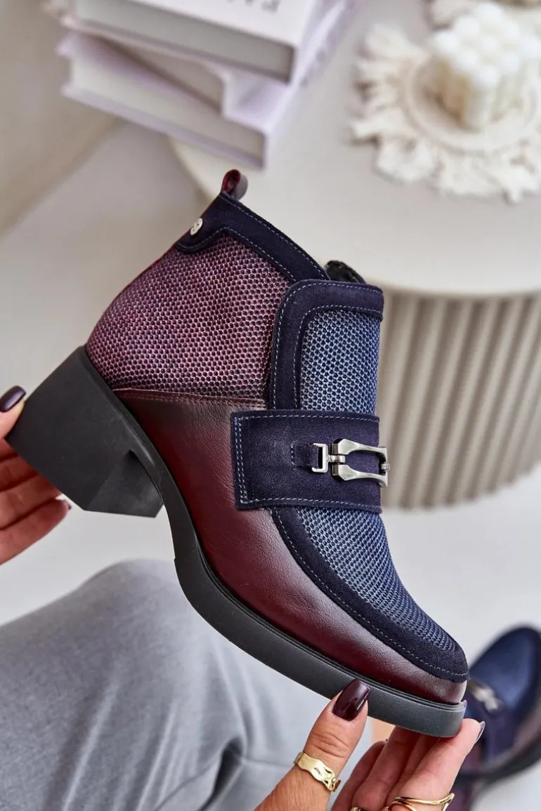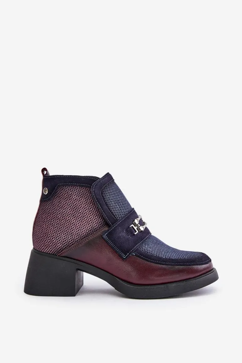 Skórzane Botki Damskie Na Masywnym Obcasie Z Ozdobą Maciejka A6747-23 Bordowo-Granatowe