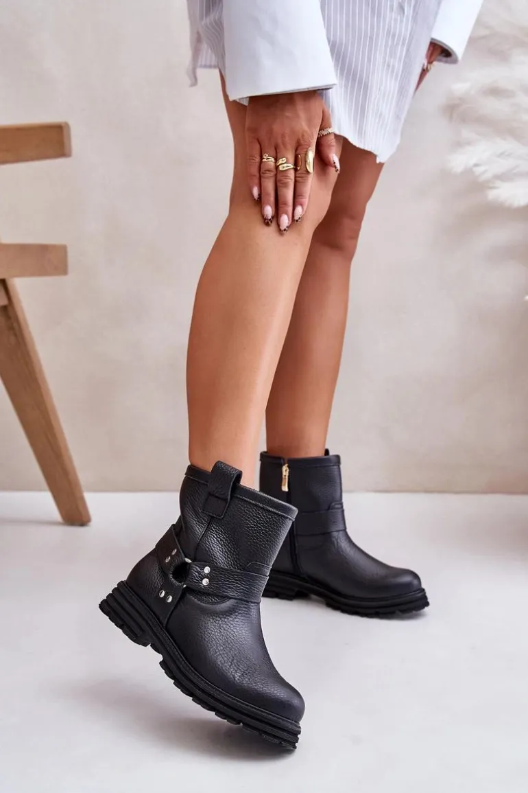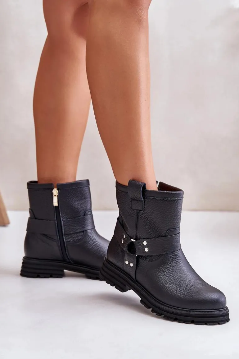 Botki wykonane z naturalnej skóry to idealny wybór na każdą okazję. Osadzone na płaskim obcasie, zapewniają komfort i stabilność podczas chodzenia. Zaokrąglone noski dodają subtelnego charakteru. Model zapinany na zamek, co ułatwia zakładanie. Cholewka ozdobiona efektownym połączeniem pasków, które dodają stylowego akcentu. Te botki świetnie sprawdzą się w codziennych stylizacjach, łącząc elegancję z wygodą. Przy wyborze rozmiaru prosimy sugerować się tabelą rozmiarów.