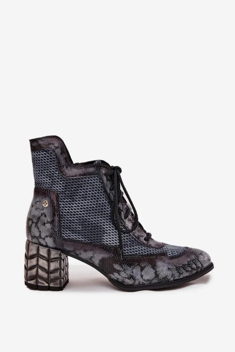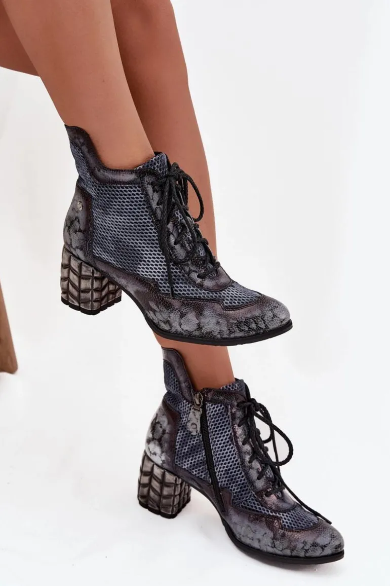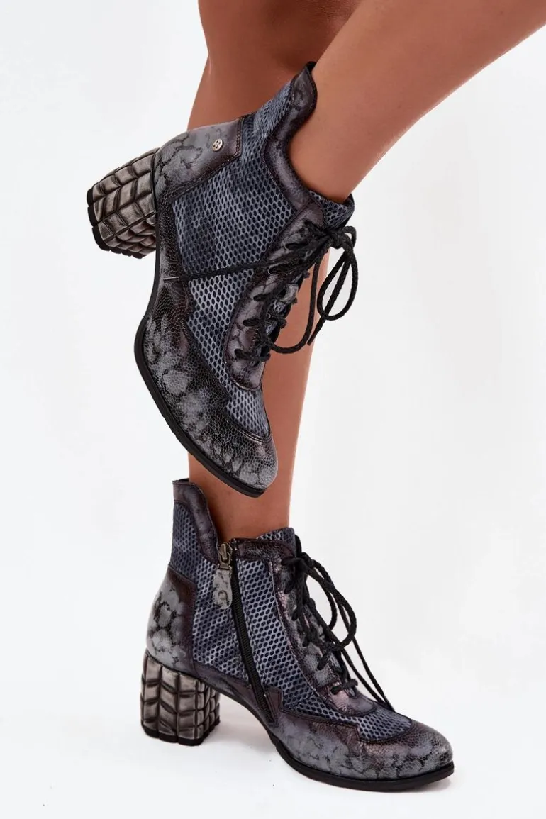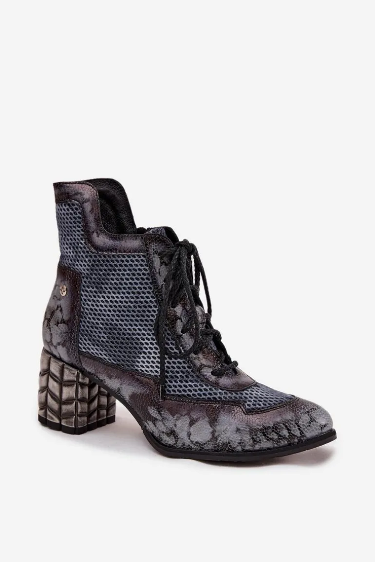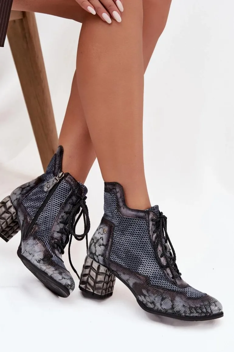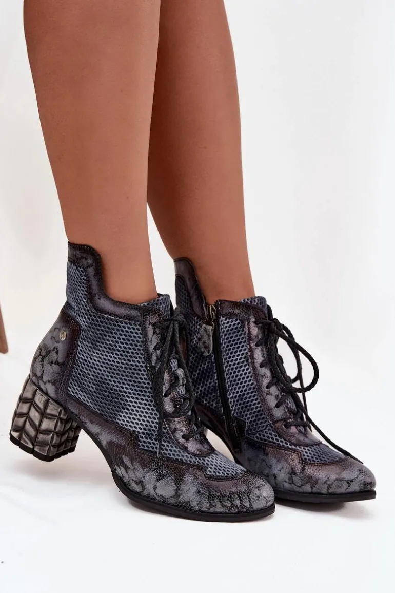 Botki damskie marki Maciejka wykonane z naturalnej skóry to propozycja dla kobiet ceniących wysoką jakość i unikalny styl. Model wyróżnia się oryginalnym wyglądem, który przyciąga uwagę i dodaje charakteru każdej stylizacji. Osadzone na stabilnym obcasie typu słupek, zapewniają wygodę noszenia oraz subtelne wysmuklenie sylwetki. Połączenie sznurowania i praktycznego zamka sprawia, że buty można łatwo dopasować do stopy. To eleganckie, a zarazem funkcjonalne botki, które świetnie sprawdzą się w sezonie jesienno-zimowym. Przy wyborze rozmiaru prosimy sugerować się tabelą rozmiarów.