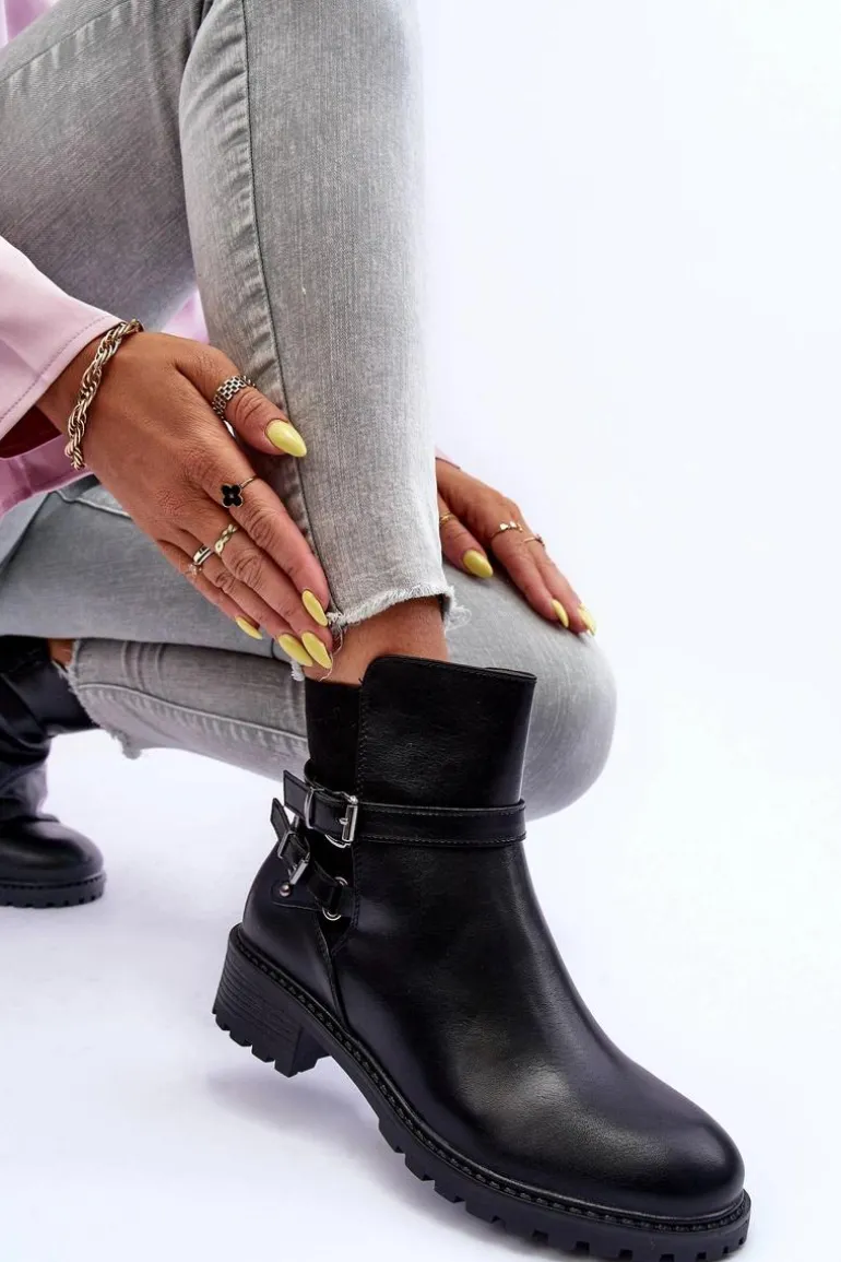 Damskie botki zostały wykonane z eko skóry. Osadzone na płaskim obcasie i platformie. Model ten zapinany jest na suwak z boku. Cholewka została ozdobiona cienkimi paskami ze sprzączką. Buty ocieplone są kocem obuwniczym. Ten model powinien znaleźć się w Twojej szafie! Przy wyborze rozmiaru prosimy sugerować się tabelą rozmiarów.