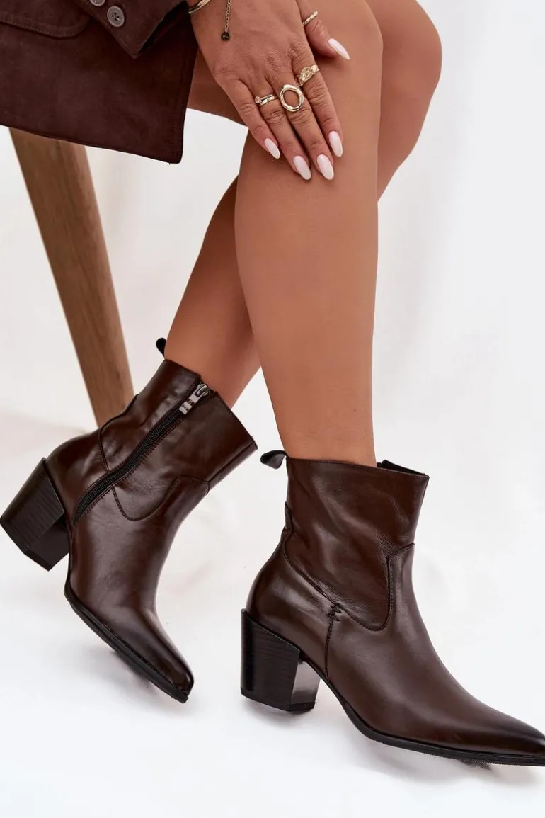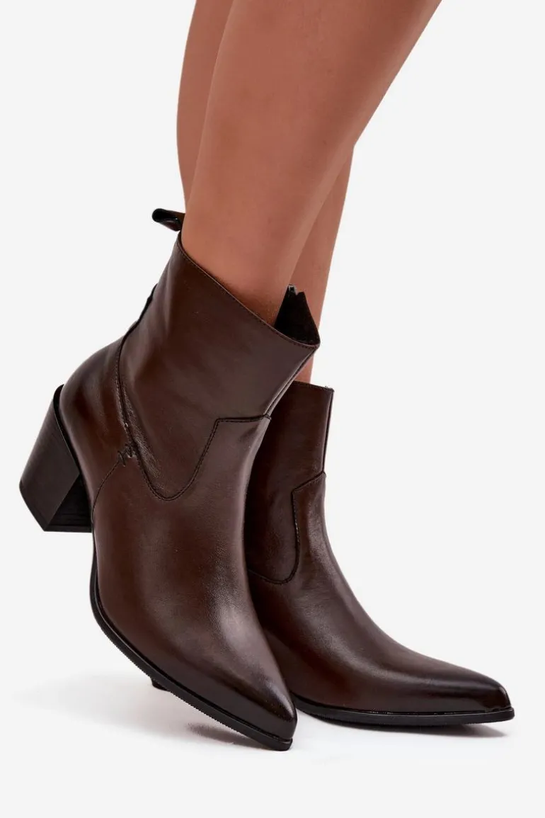 Botki kowbojki damskie z naturalnej skóry to stylowe obuwie, które łączy wygodę z charakterystycznym westernowym akcentem. Wykonane z wysokiej jakości skóry naturalnej zachwycają trwałością i estetyką, a jednocześnie zapewniają komfort podczas codziennego użytkowania. Model zapinany jest na zamek, który ułatwia zakładanie i zdejmowanie butów. Szpiczaste noski oraz ścięty obcas w formie słupka nadają całości wyjątkowego charakteru, podkreślając smukłą linię stopy. Ocieplane wnętrze gwarantuje ciepło w chłodniejsze dni, co sprawia, że botki sprawdzą się idealnie w sezonie jesienno-zimowym. To uniwersalny model, który doskonale pasuje zarówno do jeansów i ramoneski, jak i do zwiewnych sukienek, wnosząc do stylizacji nutę kobiecej swobody i nowoczesnej elegancji.Przy wyborze rozmiaru prosimy sugerować się tabelą rozmiarów.