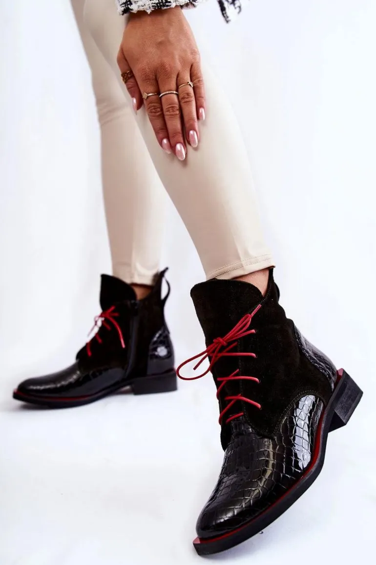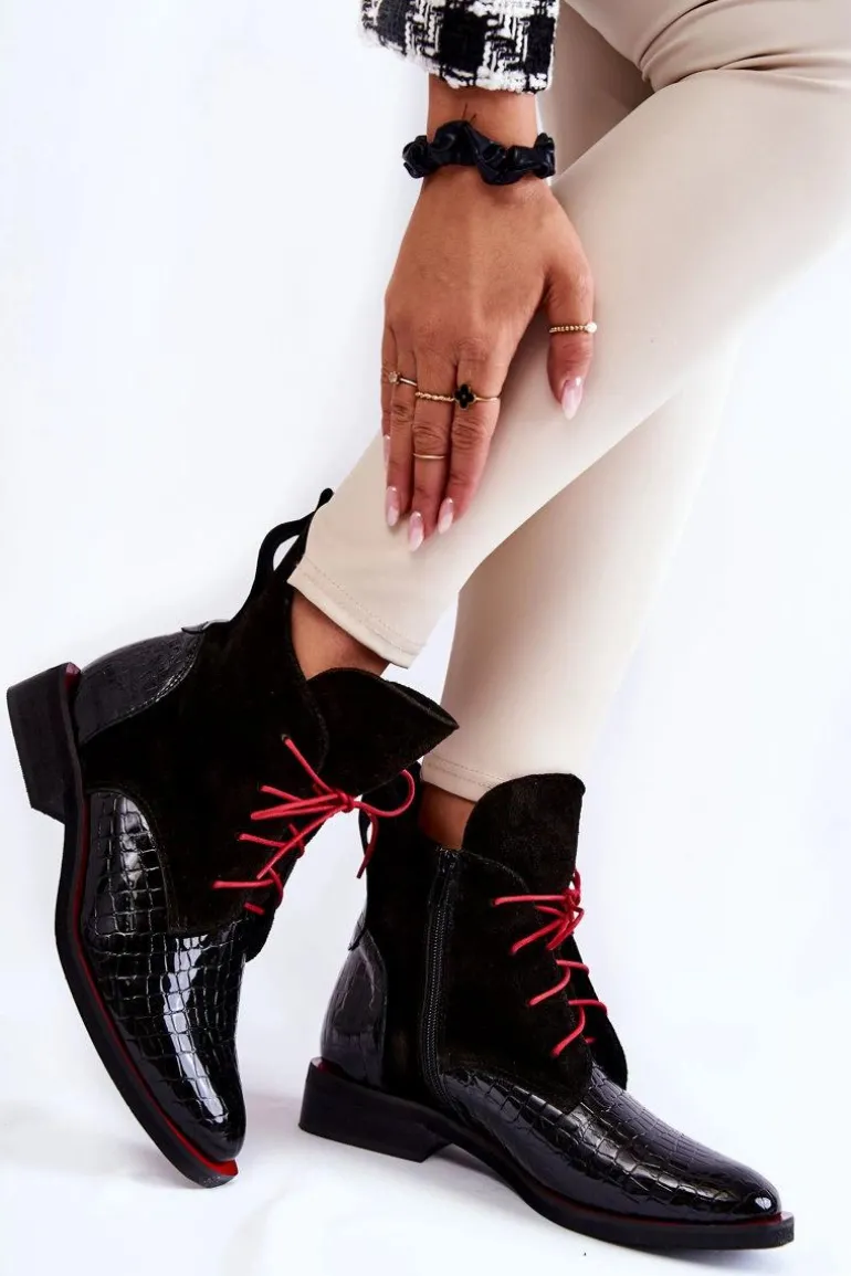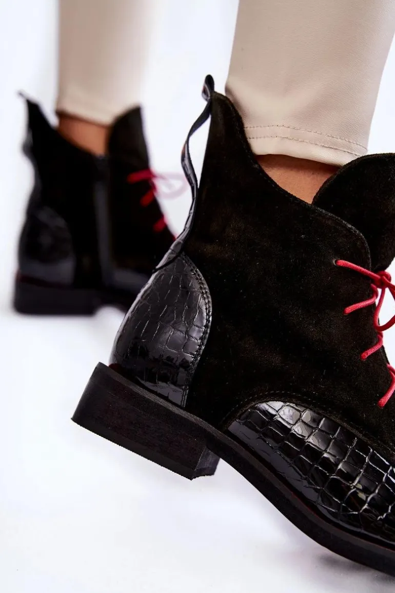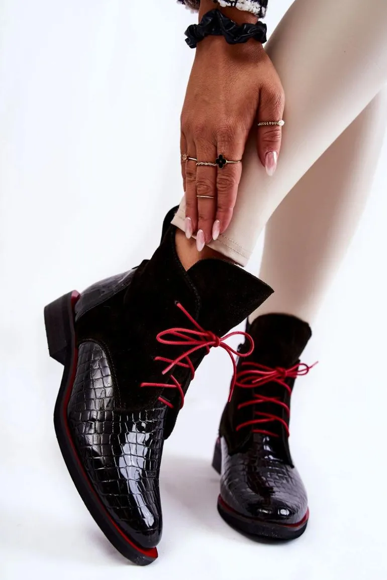 Wyjątkowe botki od polskiego producenta. Buty cechuje wysoka jakość wykonania oraz dbałość o detale. Botki wykonano ręcznie z lakierowanej skóry naturalnej oraz zamszu Skórzana wkładka, oraz wygodny obcas zapewnią maksymalny komfort! Dzięki pięknie zdobionej cholewce buty wzbogacą wszystkie Twoje stylizacje. Przy wyborze rozmiaru prosimy sugerować się tabelą rozmiarów.