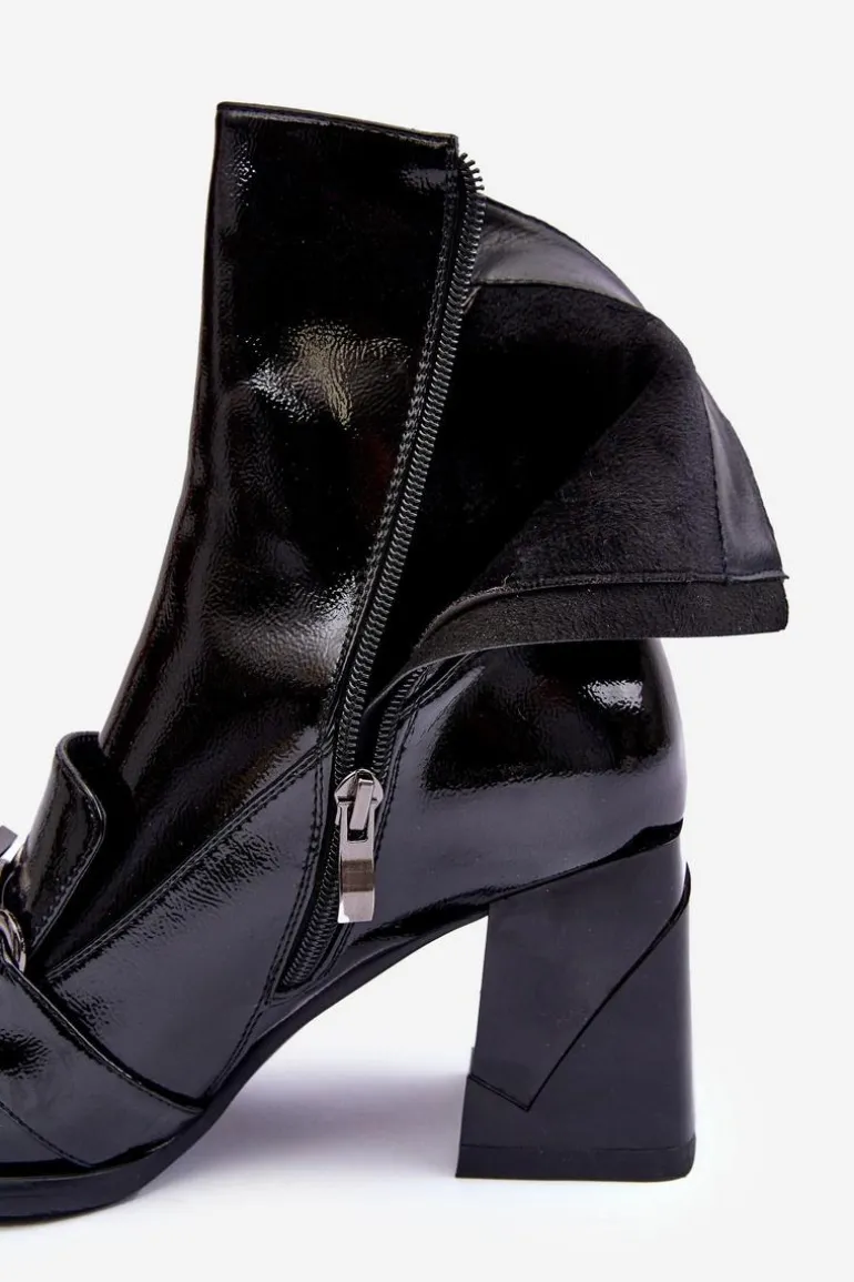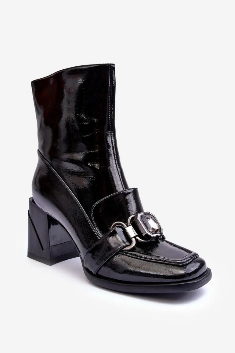 Botki damskie osadzone na masywnym obcasie. Wykonane z eko skóry. Na pasku z przodu znajduje się ozdoba. Noski w kwadrat. Środek ocieplony kocem obuwniczym. Miękka wkładka zapewni komfortowe użytkowanie obuwia. Dodatkowo zapiętek jest usztywniony. Przy wyborze rozmiaru prosimy sugerować się tabelą rozmiarów.