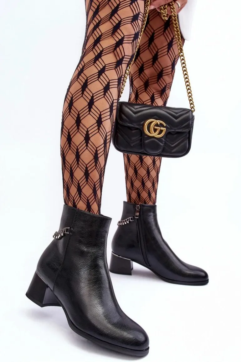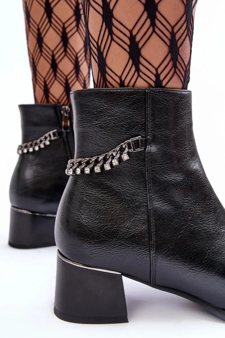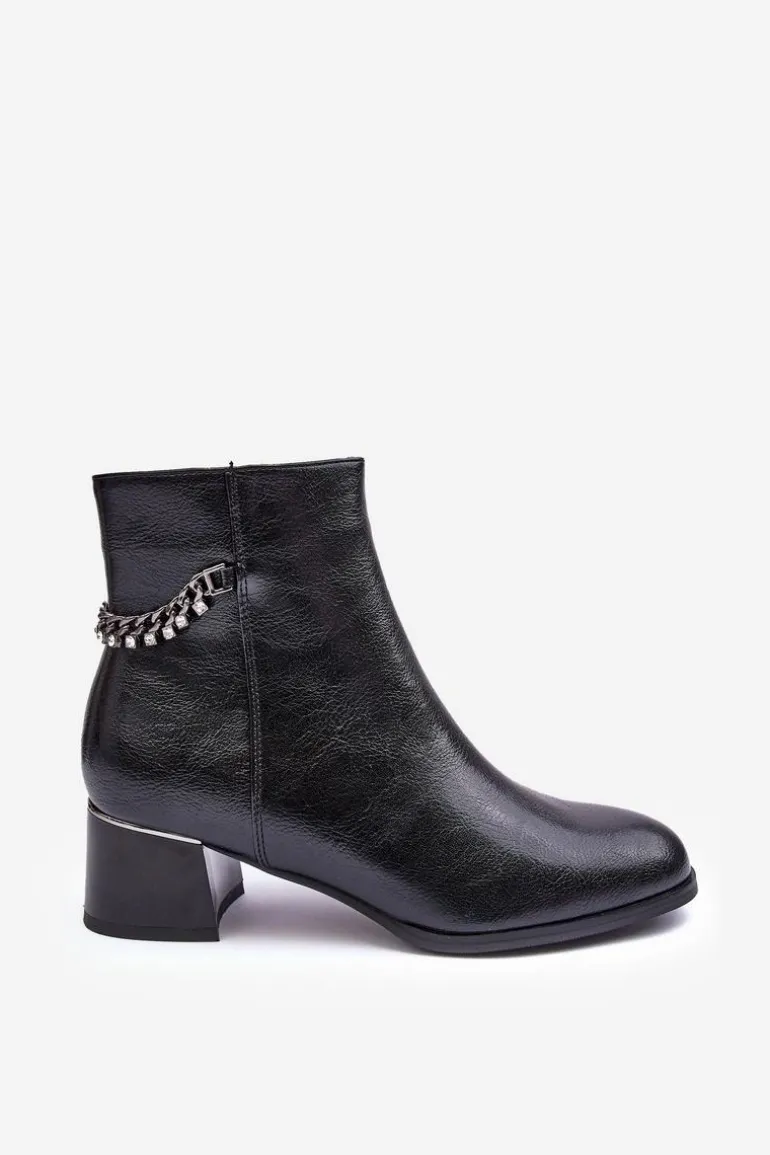 Klasyczne botki damskie osadzone na niskim obcasie z lustrzanym elementem. Wykonane z eko skóry. Zapinane na suwak po wewnętrznej stronie. Cholewka ozdobiona łańcuchem z dżetami. Wnętrze ocieplone kocem obuwniczym. Zapiętek usztywniony, noski zaokrąglone. Przy wyborze rozmiaru prosimy sugerować się tabelą rozmiarów.