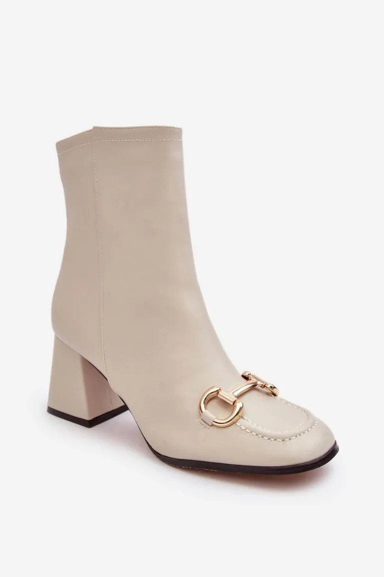 Skórzane Botki Na Obcasie Z Ozdobą Beżowe Pamelinta