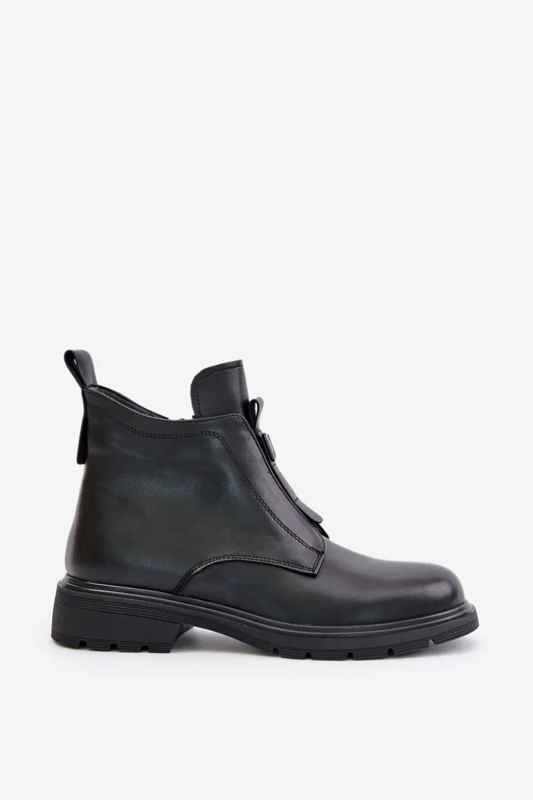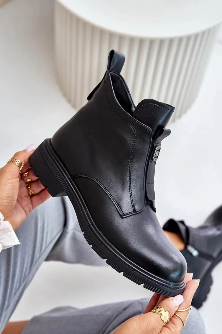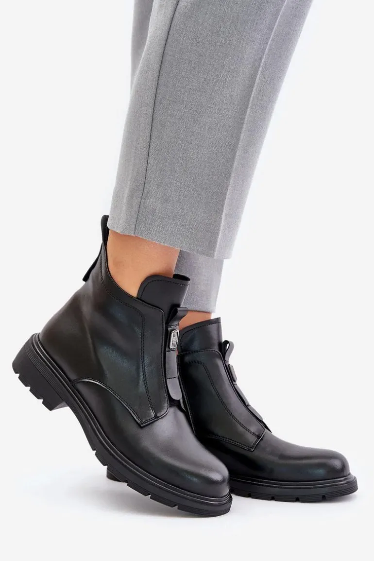 Damskie botki na płaskim obcasie, wykonane z wysokiej jakości naturalnej skóry, to stylowa i funkcjonalna opcja na chłodniejsze dni. Sięgające za kostkę, posiadają praktyczne zapięcie na zamek, które ułatwia zakładanie. Z przodu buty zdobi subtelny detal. Ocieplenie kocem obuwniczym, zapewni ciepło i komfort, idealnie wpisując się w codzienne, jesienno-zimowe stylizacje. Przy wyborze rozmiaru prosimy sugerować się tabelą rozmiarów.