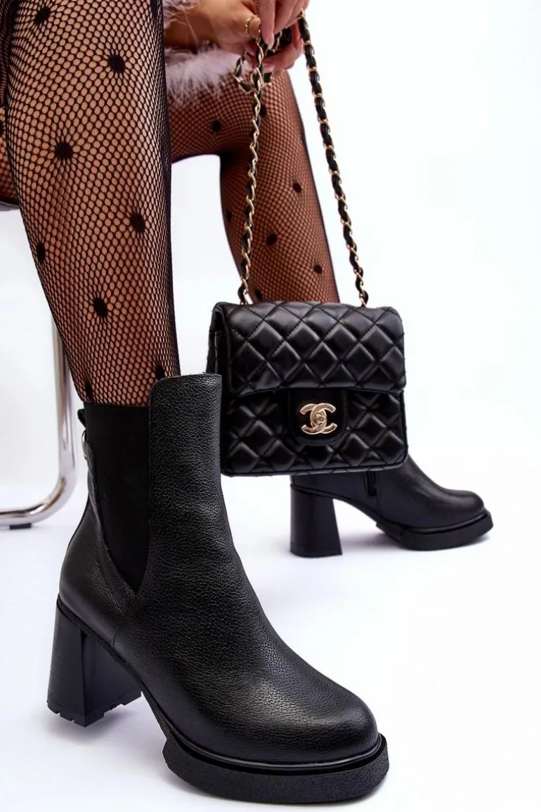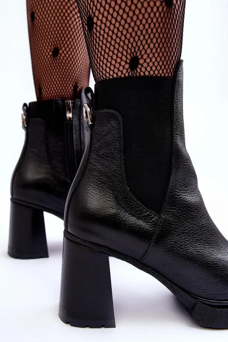 Botki na platformie i obcasie w postaci słupka. Cholewka za kostkę. Wykonane ze skóry naturalnej. Na cholewce elastyczna wstawka. Zapinane suwakiem po wewnętrznej stronie. Buty zostały ocieplone kocem obuwniczym. Podeszwa jest antypoślizgowa. Botki doskonale sprawdzą się w jesiennych stylizacjach. Przy wyborze rozmiaru prosimy kierować się tabelą rozmiarów