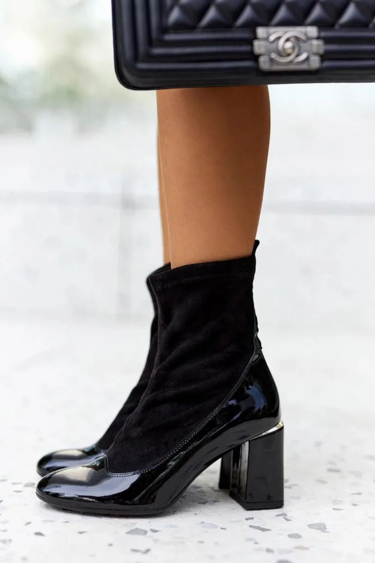 Wyjątkowe botki wykonane ze skóry naturalnej, częściowo lakierowane. Wysoka cholewka wysmukli nogi. Obcas w postaci słupka jest przyozdobiony elementem dekoracyjnym. Z tyłu cholewki widnieje napis marki Laura Messi. Nosek typu migdał. Koniecznie musisz je mieć !Przy wyborze rozmiaru prosimy sugerować się tabelą rozmiarów.