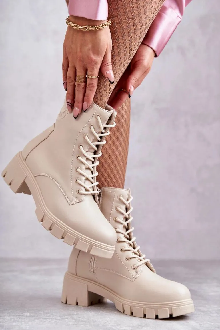 Damskie botki z wyższą cholewką za kostkę zostały wykonane z przyjemnej w dotyku eko skóry. Model ten posiada wiązanie oraz suwak. Osadzone na platformie oraz płaskim obcasie. Podeszwa jest wykonana z gumowego tworzywa. Botki posiadają w środku ocieplenie w postaci miłego w dotyku koca obuwniczego. Zapiętek usztywniany pozwoli na odpowiednią stabilizację stopy. Przy wyborze rozmiaru prosimy sugerować się tabelą rozmiarów.