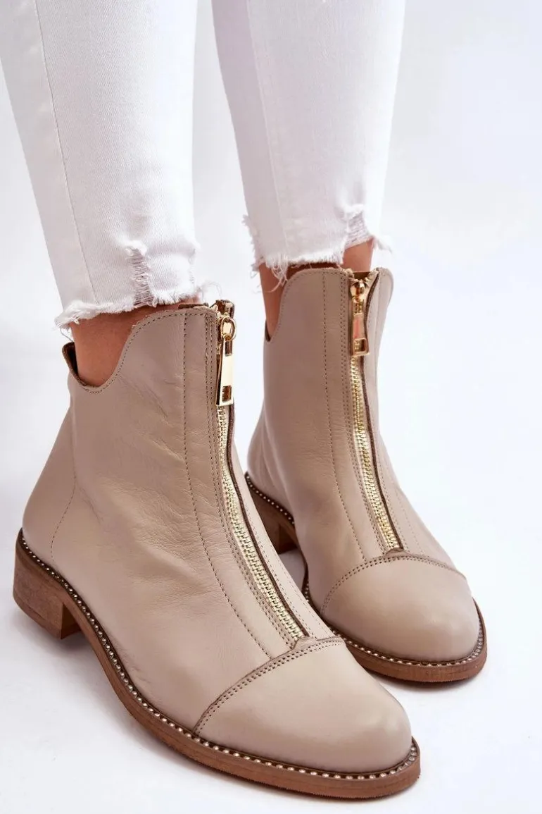 Modne botki damskie zostały wykonane z wysokiej jakości skóry naturalnej. Posiadają suwak na przodzie cholewki. Buty zostały osadzone na płaskim obcasie. Dodatkowo posiadają usztywniany zapiętek. Miękka, skórzana wkładka zapewni Ci wysoki komfort użytkowania przez cały dzień! Koniecznie powinnaś je mieć! Przy wyborze rozmiaru prosimy sugerować się tabelą rozmiarów.