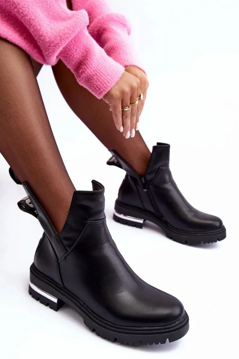 Botki damskie na płaskim obcasie. Wykonane z eko skóry. Wewnątrz ocieplone kocem obuwniczym. Cholewka z wycięciami na bokach. Na obcasie lustrzana ozdoba. Noski zaokrąglone. Model ten z tyłu cholewki posiada napis. Dodatkowo zapiętek jest usztywniony. Przy wyborze rozmiaru prosimy sugerować się tabelą rozmiarów.