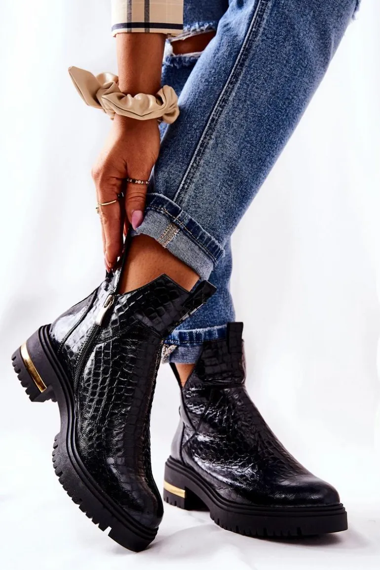 Skórzane Botki Ocieplane Krokodyl Czarne Tanya