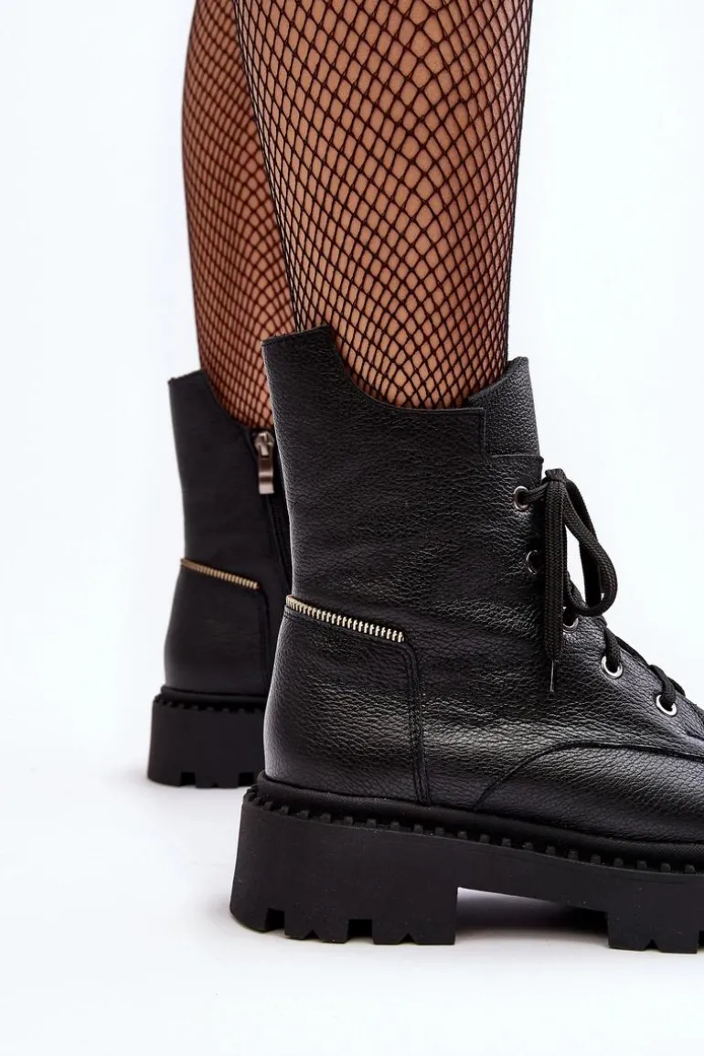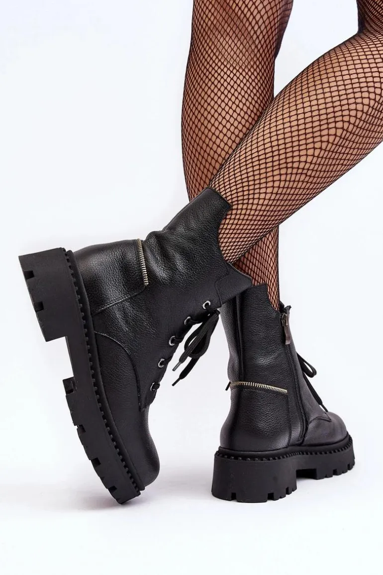 Botki damskie z cholewką za kostkę. Wykonane ze skóry naturalnej. Osadzone na płaskim obcasie oraz platformie. Zapinane na suwak. Noski zaokrąglone. Usztywniony zapiętek. Środek ocieplony kocem obuwniczym. Przy wyborze rozmiaru prosimy sugerować się tabelą rozmiarów.