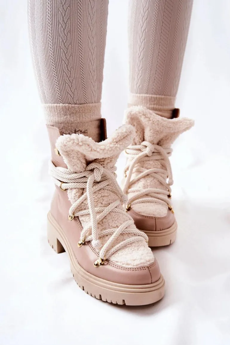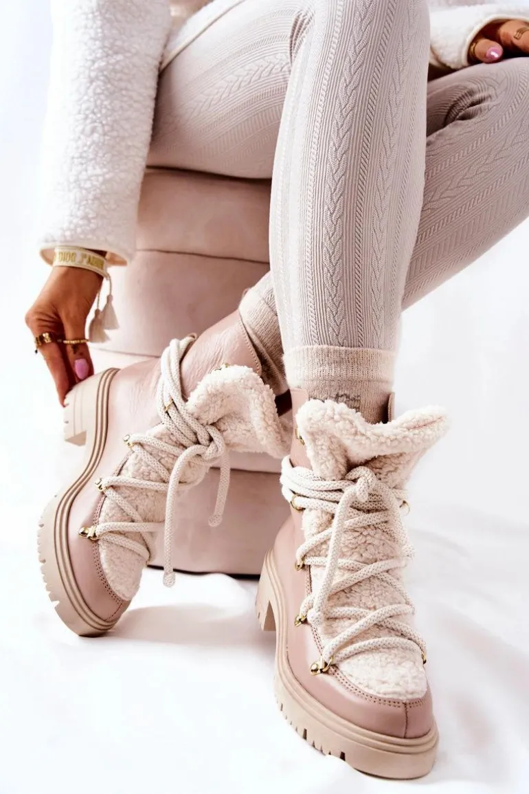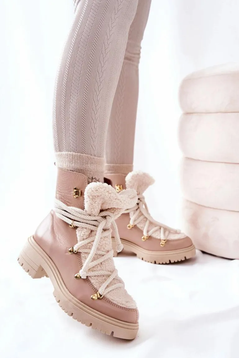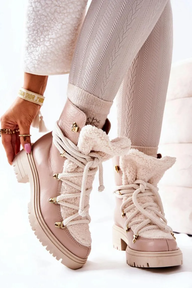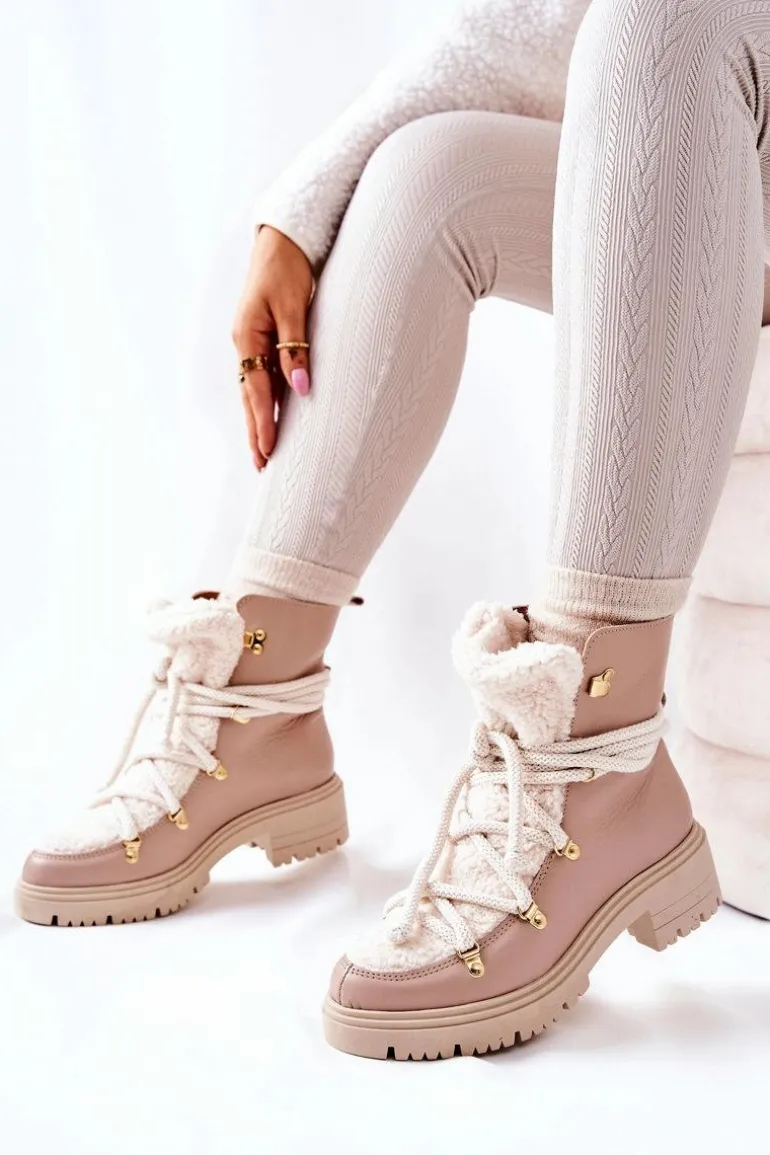 Skórzane Botki Trapery Wiązane Lewski Beżowe 3116