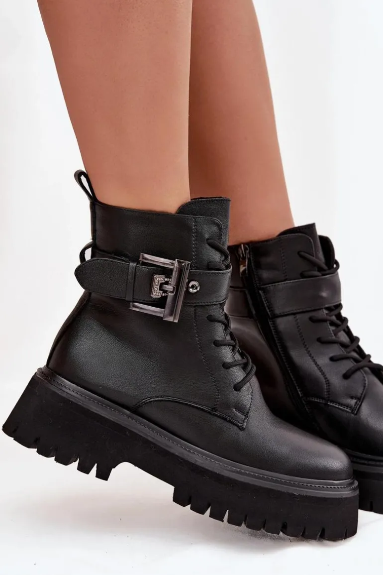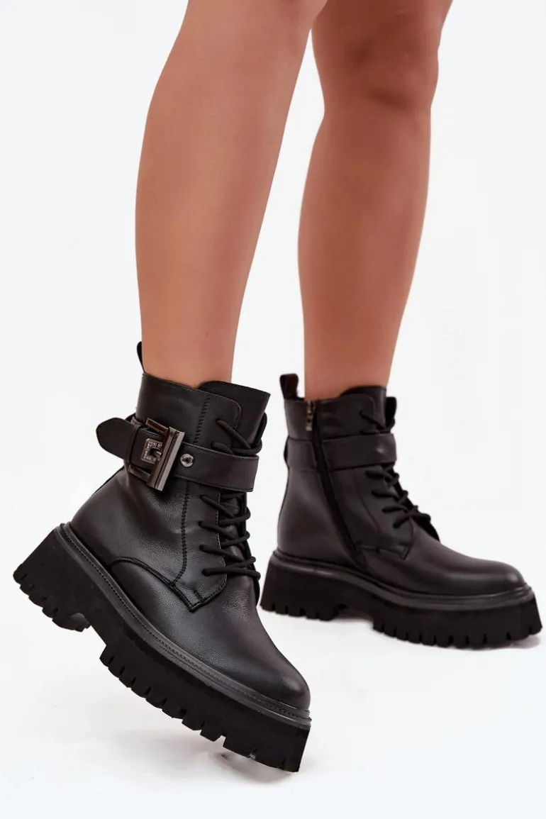 Botki workery damskie wykonane z naturalnej skóry. Model osadzony na platformie zapewnia stabilność oraz wygodę noszenia. Buty są sznurowane i zapinane na zamek, dzięki czemu doskonale dopasowują się do stopy i łatwo je zakładać. Wnętrze zostało ocieplone, co gwarantuje komfort i ciepło w chłodniejsze dni. Ozdobny pasek z klamrą nadaje im charakteru i modnego, lekko rockowego stylu. To doskonały wybór do codziennych stylizacji. Przy wyborze rozmiaru prosimy sugerować się tabelą rozmiarów.