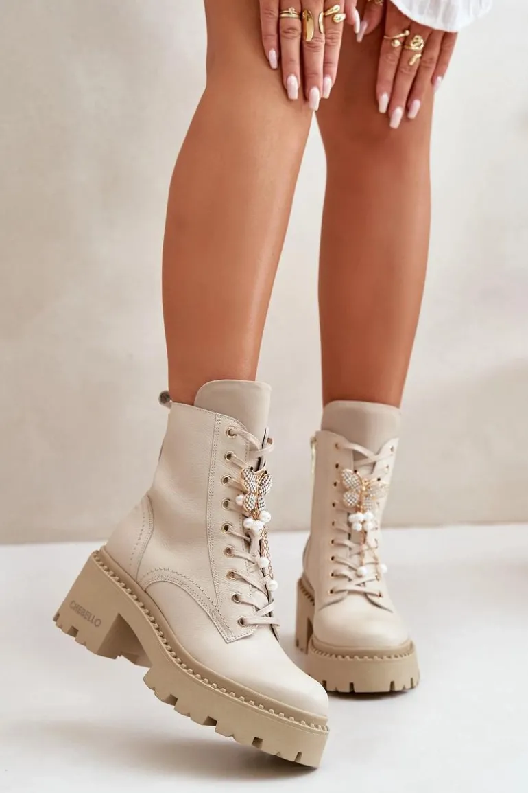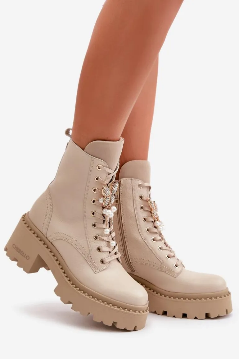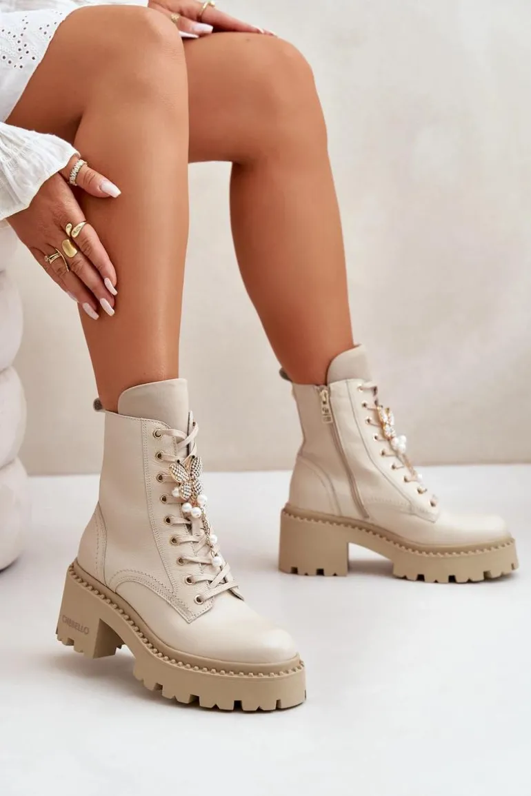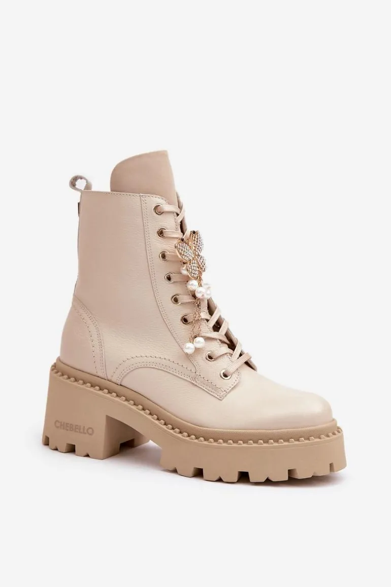 Botki marki CheBello wykonane z wysokiej jakości skóry naturalnej. Wnętrze lekko ocieplone, co zapewnia komfort noszenia w chłodniejsze dni. Model ten wyróżnia się uroczą przypinką w postaci motyla z koralikami. Noski zaokrąglone. Koniecznie powinnaś je mieć w swojej jesienno-zimowej szafie! Przy wyborze rozmiaru prosimy sugerować się tabelą rozmiarów.
