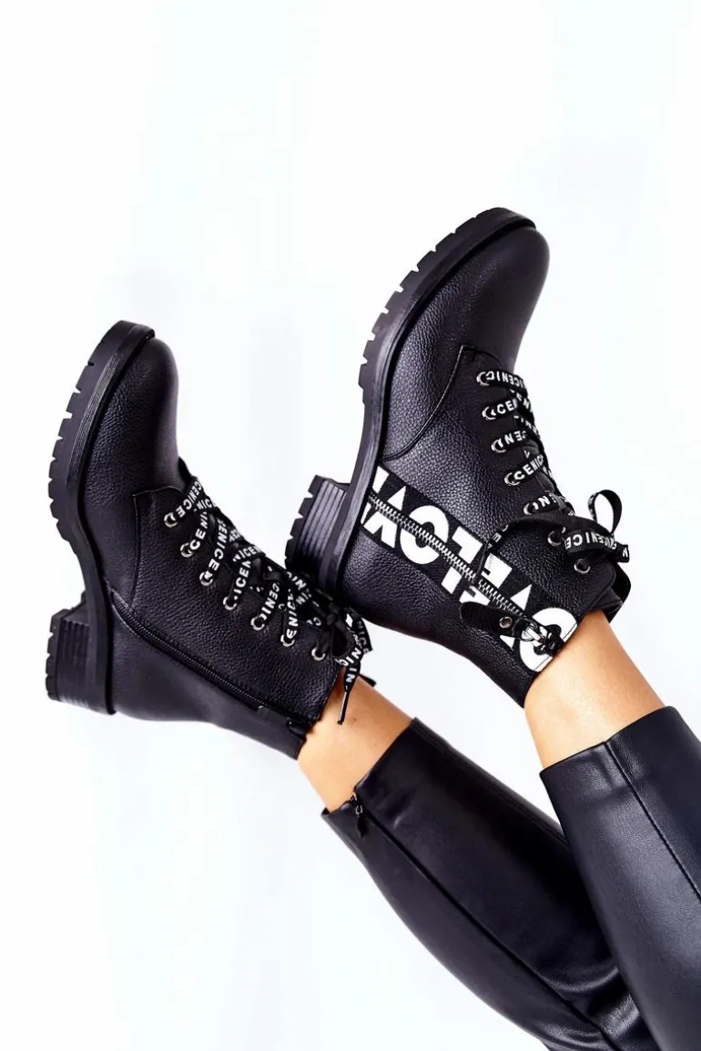 Piękne botki workery zostały wykonane z zewnątrz z eko skóry, natomiast w środku z materiału tekstylnego. Posiadają dwa suwaki, choć jeden z nich jest elementem ozdobnym. Ciekawy wzór na sznurówkach oraz z boku cholewki sprawia, że są naprawdę wyjątkowe. Workery są ocieplone kocem obuwniczym oraz posiadają miękką wkładkę. Przy wyborze rozmiaru prosimy sugerować się tabelą rozmiarów.