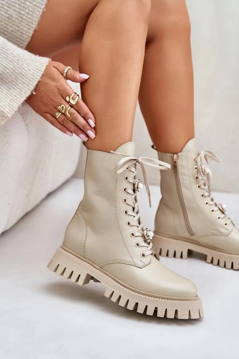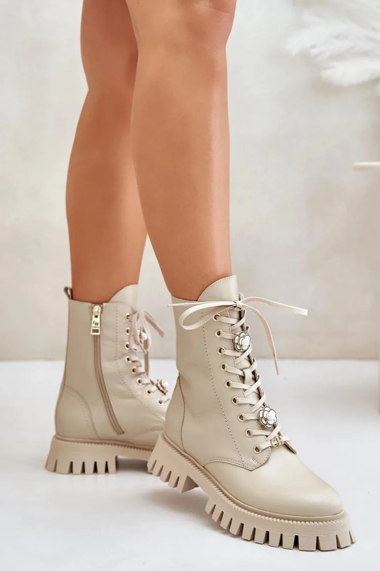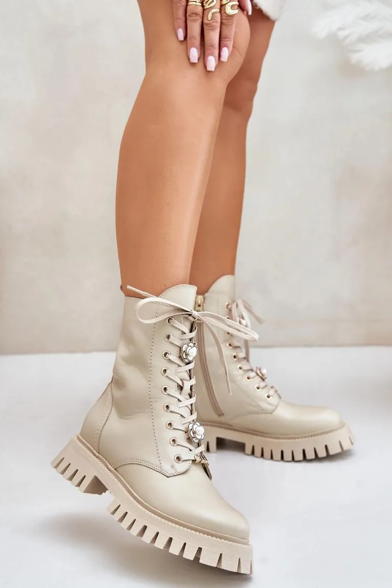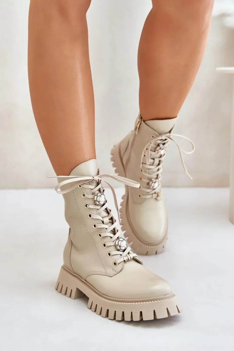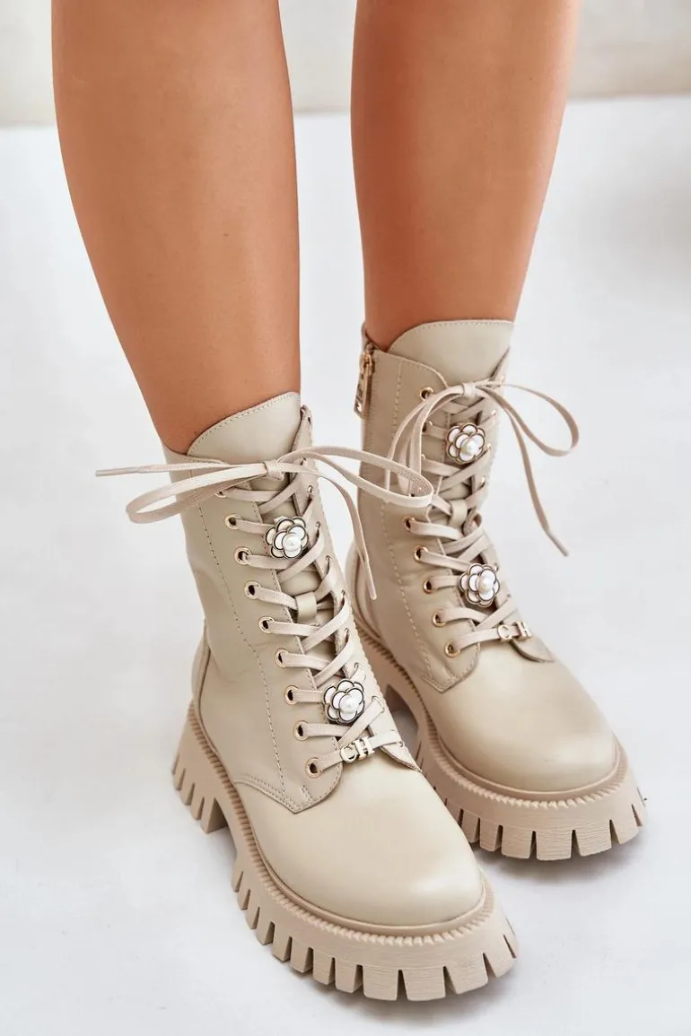 Śliczne botki wykonane z naturalnej skóry to stylowy wybór na każdą okazję. Osadzone na płaskim obcasie, zapewniają wygodę przez cały dzień. Model posiada zarówno sznurowanie, jak i zamek, co ułatwia dopasowanie oraz szybkie zakładanie. Dodatkową ozdobą są urocze przypinki na sznurowaniu. Idealne dla osób ceniących komfort i oryginalny styl w jednym. Przy wyborze rozmiaru prosimy sugerować się tabelą rozmiarów.