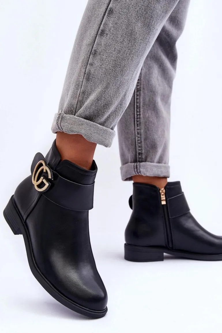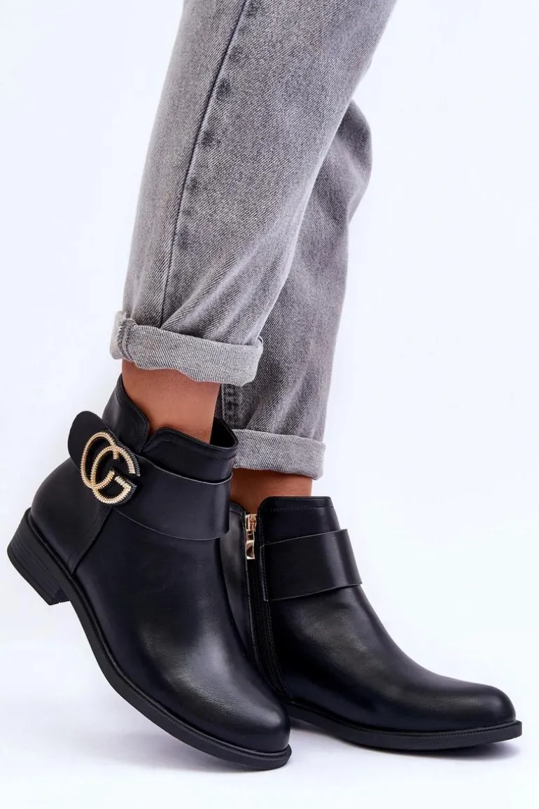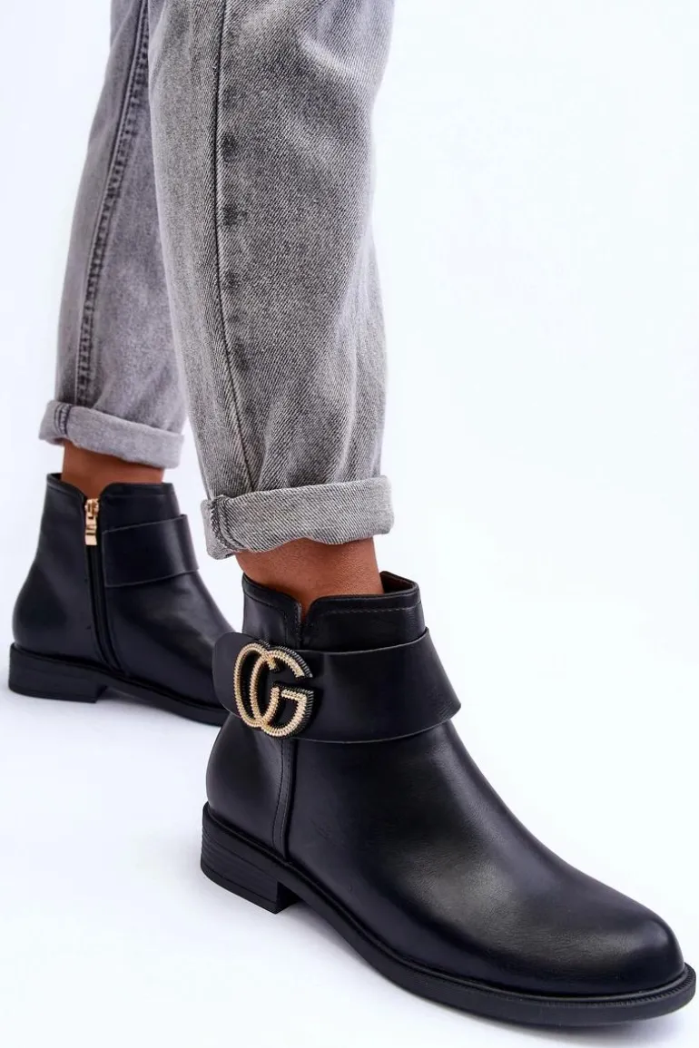 Klasyczne botki damskie wykonane z eko skóry. Zapinane na suwak po wewnętrznej stronie buta. Model ten osadzony został na płaskim obcasie z zaokrąglonym noskiem. Na pasku znajduje się ozdoba. Każda stylizacja w połączeniu z nimi będzie świetnie wyglądać! Przy wyborze rozmiaru prosimy sugerować się tabelą rozmiarów.