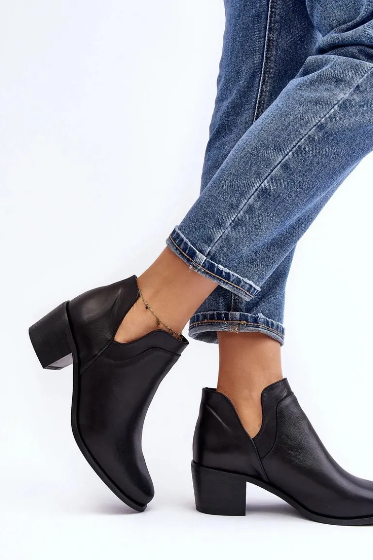 Damskie, wsuwane botki zostały wykonane z wysokiej jakości naturalnych skór. Model z modnymi wycięciami po bokach cholewki. Miękka wkładka zapewni komfort podczas użytkowania. Dodatkowo zapiętek jest usztywniany. Osadzone na niskim obcasie w postaci klocka. Te botki świetnie sprawdzą się w wielu stylizacjach! Powinnaś mieć je w swojej szafie! Przy wyborze rozmiaru prosimy sugerować się tabelą rozmiarów.