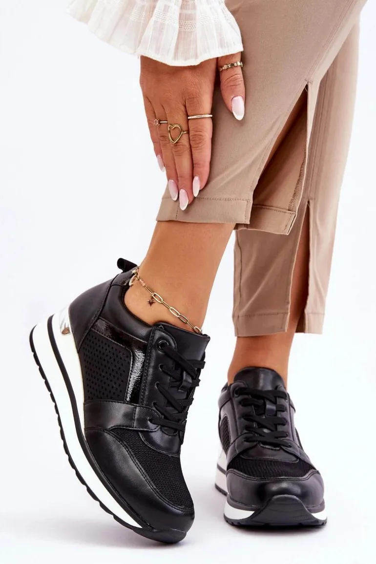 Wygodne sneakersy wykonane z eko skóry z delikatną perforacją po bokach cholewki oraz wstawką z przodu z materiału. Model klasycznie sznurowany. Buty zostały osadzone na platformie oraz niewysokim koturnie. Miękka wkładka zapewni komfortowe użytkowanie obuwia nawet przez cały dzień! Przy wyborze rozmiaru prosimy kierować się tabelą rozmiarów.