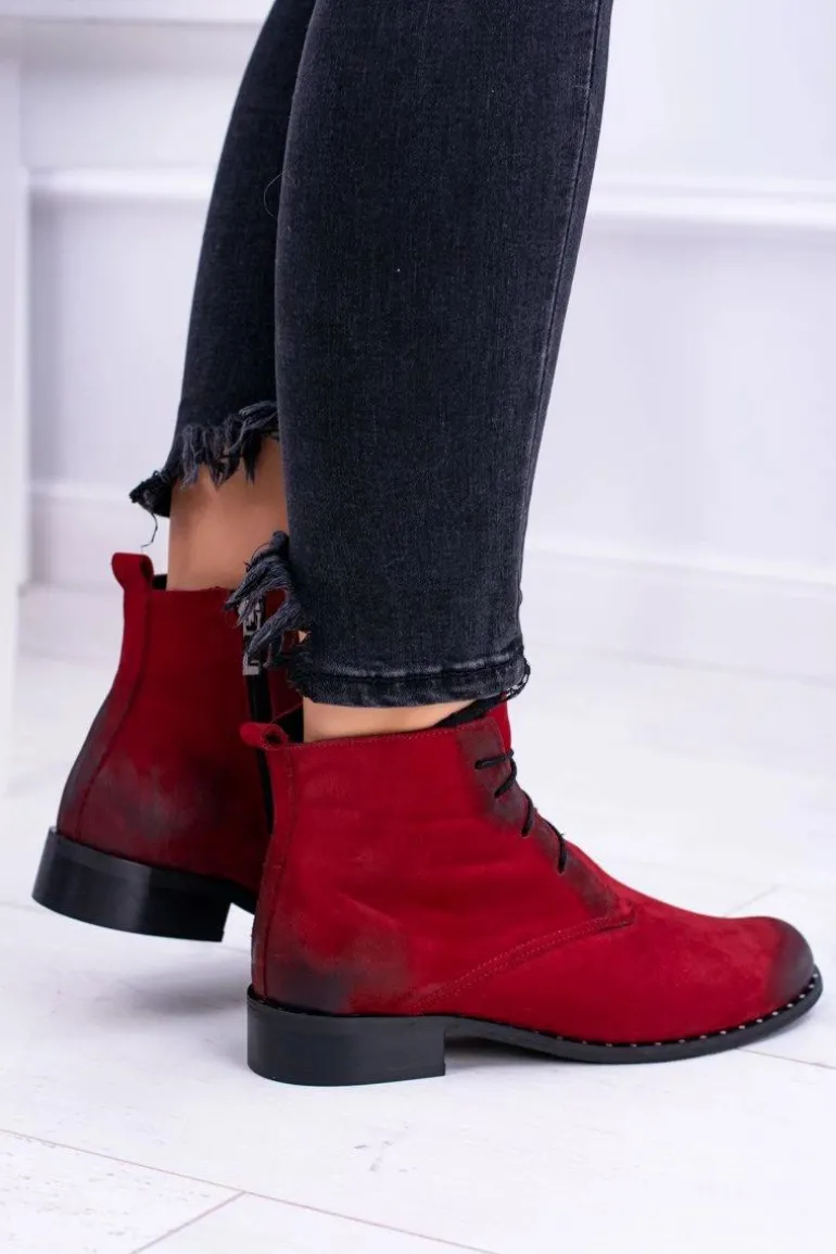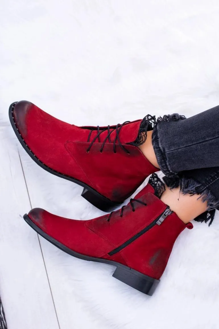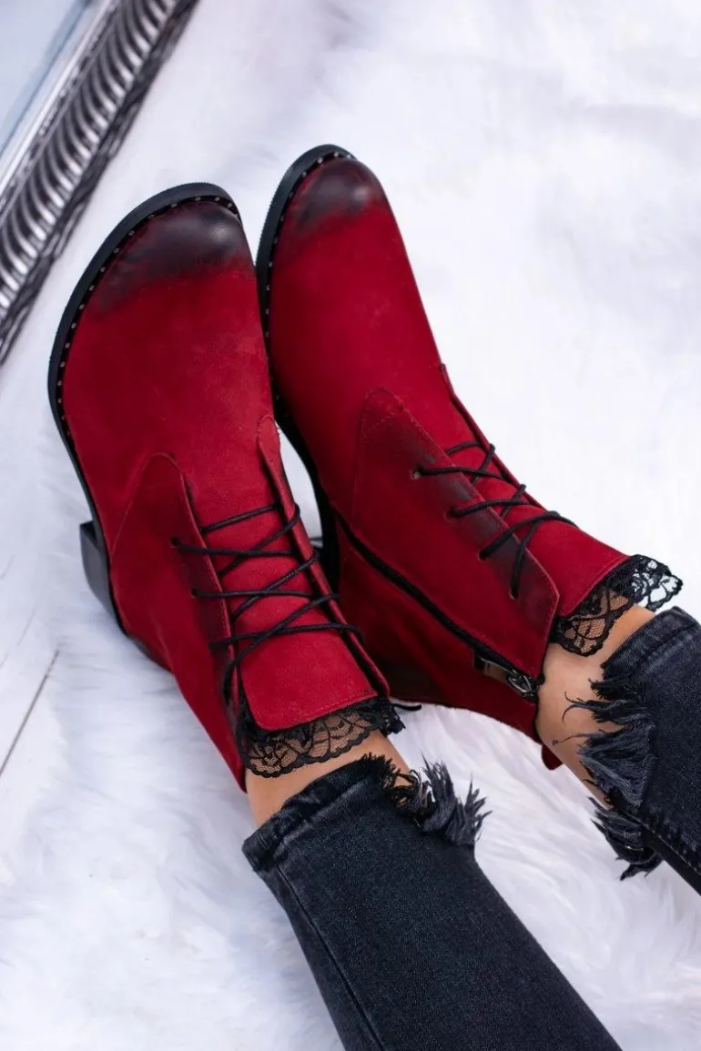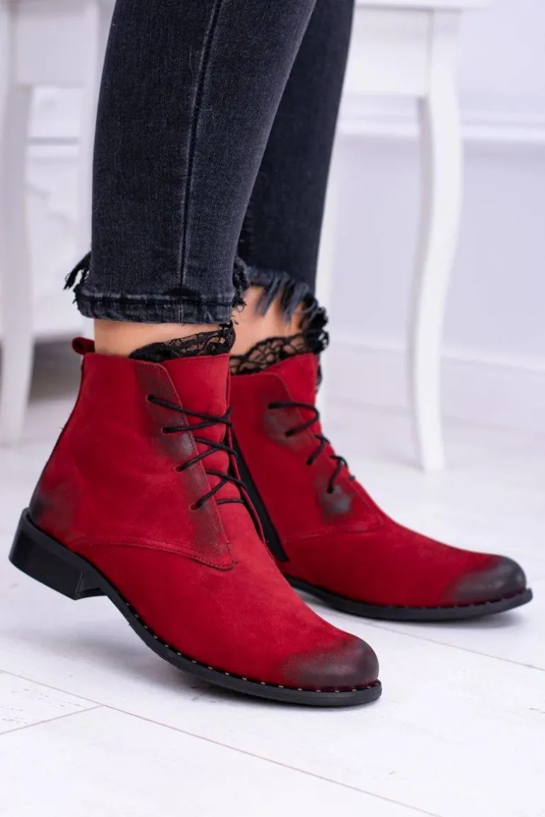 Skórzane Czerwone Damskie Botki Z Koronką Millano