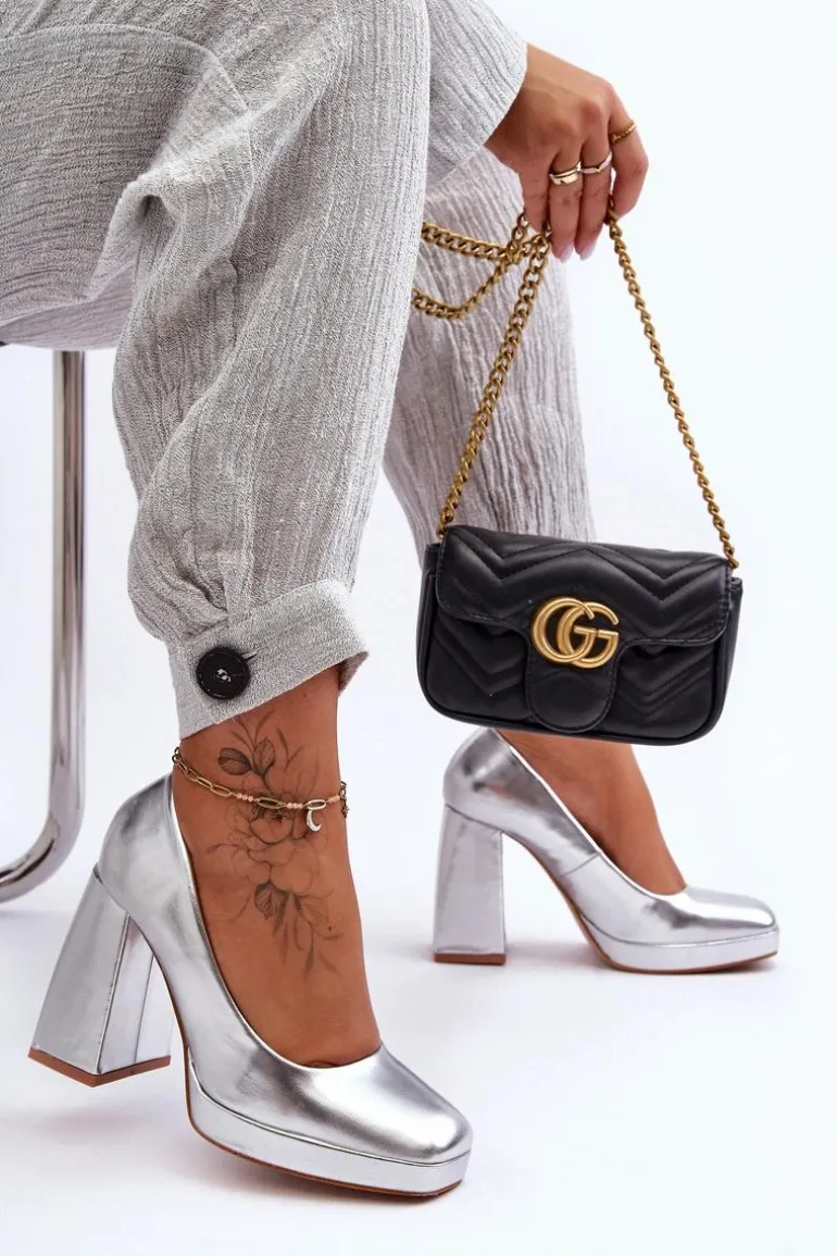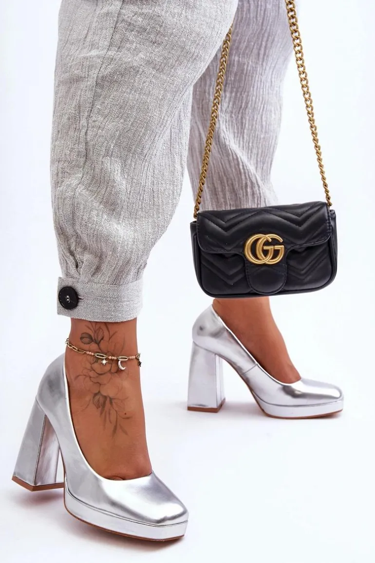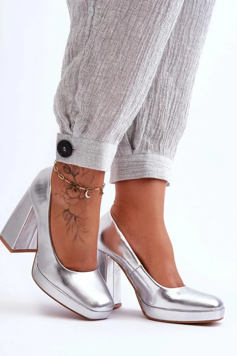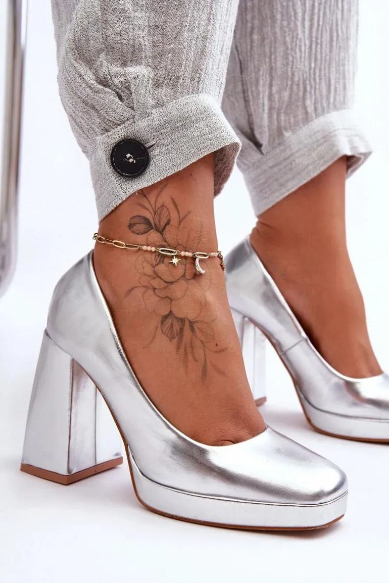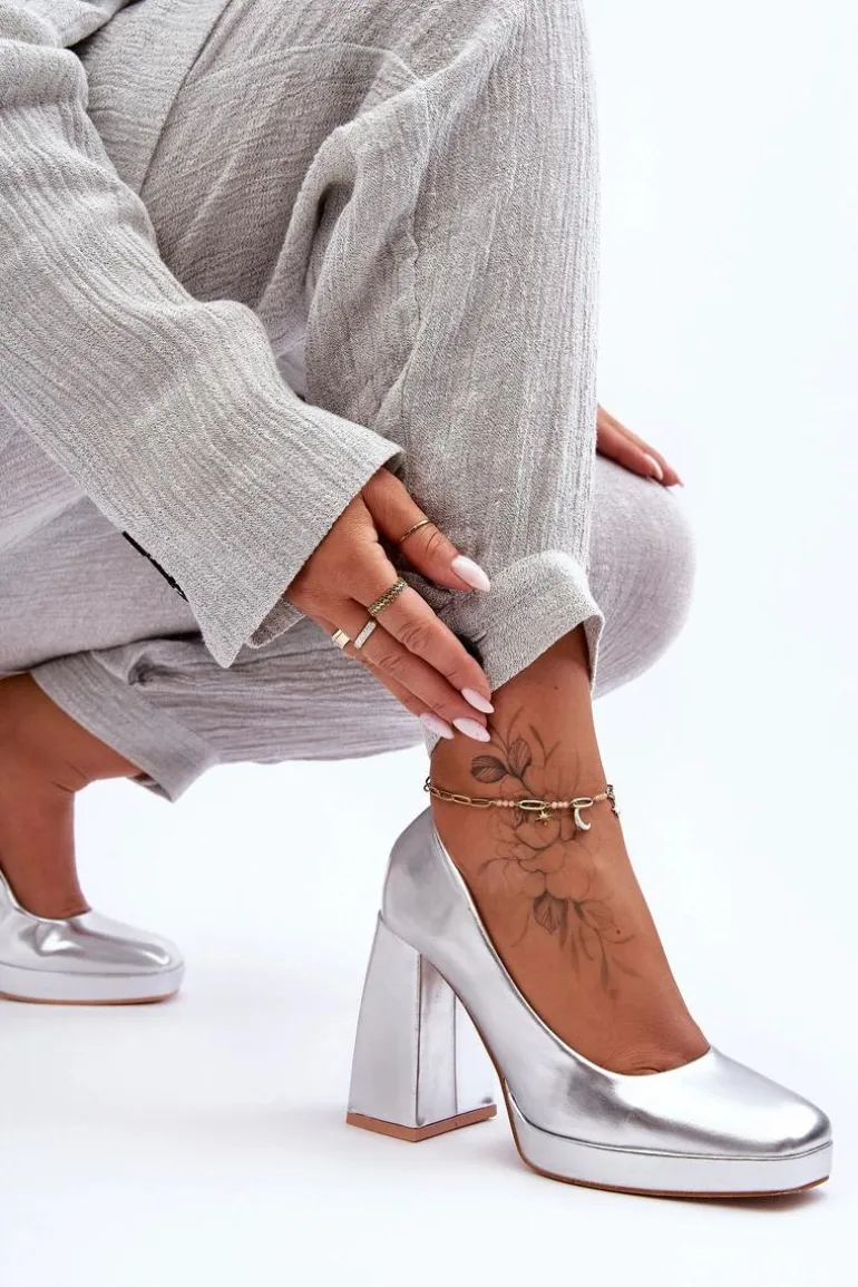 Skórzane Czółenka Na Masywnym Obcasie Srebrne Rosalia