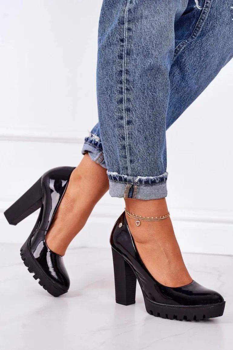 Skórzane Czółenka Na Słupku Maciejka 02629-05 Lakierowane Czarne