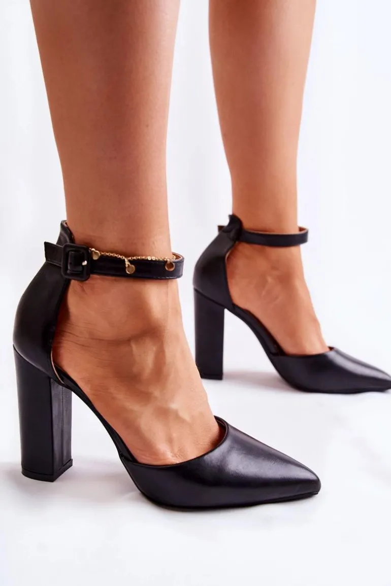 Klasyczne czółenka osadzone na wysokim obcasie w postaci słupka. Zapinane na regulowany pasek ze sprzączką znajdującą się na wysokości kostki z dodatkową gumką. Model z noskiem w szpic. Buty te zostały wykonane z eko skóry. Model z usztywnianym zapiętkiem. Idealne do wieczorowych sukienek czy eleganckich kombinezonów. Świetnie sprawdzą się podczas wielu uroczystości. Przy wyborze rozmiaru prosimy sugerować się tabelą rozmiarów.